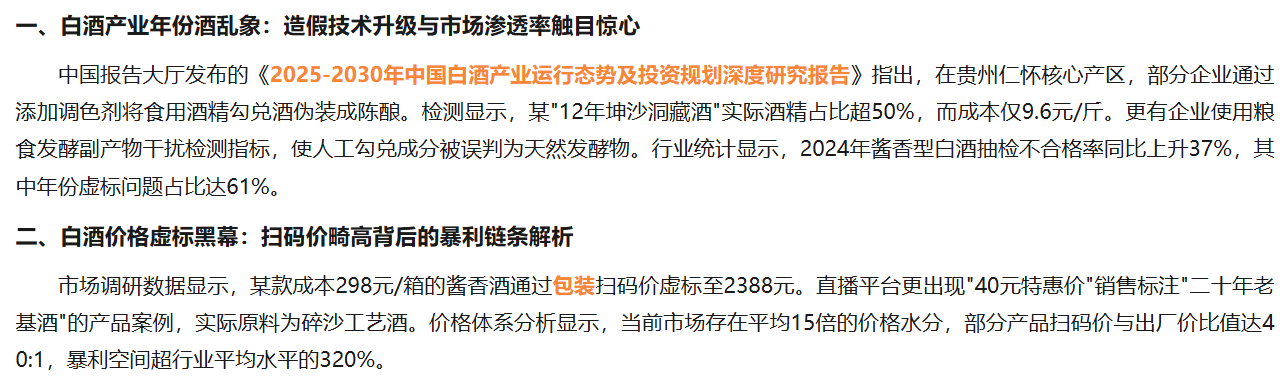 假年份酒泛滥!真年份酒遭殃?这场年份造假的信任危机如何破解?近期,怀仁市、遵义市、郑州市均开展了打击白酒造假整治行动,尤其是对虚假“年份酒”的打击,而贵州省也建立酱香白酒生产销售整治规范市县联动机制,并规划开展白酒保知打假专项整治,严厉打击制假售假、虚假宣传等问题,一方面强化溯源管理;另一方面强化产品追踪。 行业监管重拳出击的背后,是一场因“假年份酒”泛滥而引发的深重信任危机。它不仅直接侵害消费者权益,更如毒瘤般侵蚀着整个白酒市场的健康肌体,使真正坚守品质、投入巨大成本酿造的真年份酒陷入被误伤、被挤压的艰难处境。 当消费者面对货架上琳琅满目的“年份”标签却无从辨别真伪时,整个市场赖以生存的诚信基石正遭遇前所未有的动摇。这场危机如何化解?真年份酒又该如何突围? 01假年份酒冲击白酒市场 1)市场信任危机:动摇消费者信任,真年份酒被殃及池鱼 假年份酒通过虚标年份、以次充好等手段,利用消费者对“老酒=好酒”的朴素认知进行欺诈。例如,部分商家将3年基酒标注为“30年陈酿”,甚至直接在包装上伪造年份信息。这种行为导致消费者对年份酒的整体信任度下降,有可能让消费者对“年份酒”概念产生质疑,而且这种不信任可能蔓延至真年份酒,即使其符合标准,消费者也会因无法辨别真假而降低购买意愿。 假年份酒利用了消费者对于“酒是陈的香”这一传统认知的心理预期,通过虚标年份、模糊基酒比例甚至完全伪造年份信息等手法,将新酒或普通勾兑酒包装成价值不菲的“陈年佳酿”。当消费者屡次发现花费不菲购入的所谓“十年陈”、“三十年陈”口感单薄、品质平平,甚至饮后不适时,其对“年份酒”这一概念的信任感会迅速崩塌。 这种不信任感**传染性,它不会精准区分造假者与诚信者,而是对整个“年份酒”品类产生普遍质疑。最终的结果是,即使那些严格遵守标准、真实标注年份、投入巨大时间与成本储存基酒的真年份酒品牌,也会被拖入信任泥潭。消费者因缺乏简单有效的辨别手段,往往选择宁缺毋滥,降低对整个品类的购买意愿和支付溢价,真年份酒成为假酒横行的**牺牲品。 2)市场竞争扭曲:价格体系崩塌,劣币驱逐良币 假年份酒更在根本上扭曲了市场的价格形成机制和公平竞争环境。其制假成本极其低廉——可能仅需使用普通食用酒精进行勾兑,每斤成本不过数元。然而,一旦披上虚假的“年份”外衣,这些劣质酒便能摇身一变,以数百元甚至上千元的高价出售,攫取远超其实际价值的惊人暴利。 反观真年份酒,其成本构成则沉重得多。从优质原粮的采购、固态发酵的漫长周期、到基酒长达数年乃至数十年的专业仓储管理(期间占用的资金成本、仓储损耗、管理成本等),每一环节都意味着真金白银的投入。一瓶真正的五年、十年陈酿,其合理的成本底线远非造假者可比。
