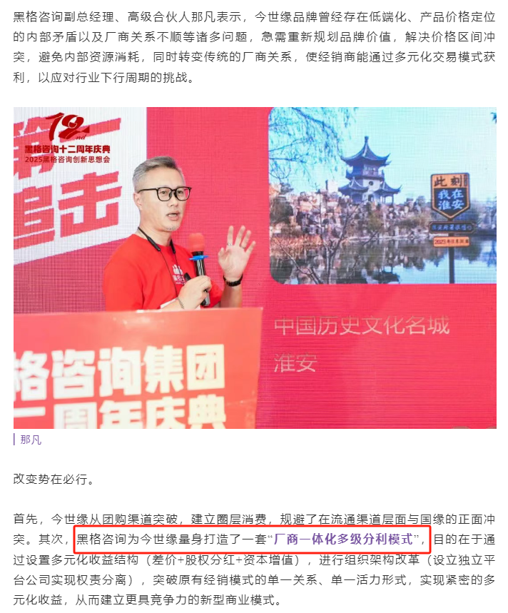 能够取得这样的成绩,与今世缘在厂商关系的建设上密不可分。今世缘敏锐察觉到建设新型厂商一体化体系势在必行。而厂商一体化的至高境界就是“厂商命运共同体”,实现厂家与商家,品牌与市场的共生共荣。24年10月,今世缘·典藏宝石系列在深证首发时,推出了白酒行业首创的厂商一体化“多级红利”模式,真正实现厂商命运共同体。 据云酒头条报道,这一模式由黑格咨询为今世缘量身打造,其目的是通过设置多元化收益结构(差价+股权分红+资本增值),进行组织架构改革(设立独立平台公司实现权责分离),突破原有经销模式的单一关系、单一活力形式,实现紧密的多元化收益,从而建立更具竞争力的新型商业模式。