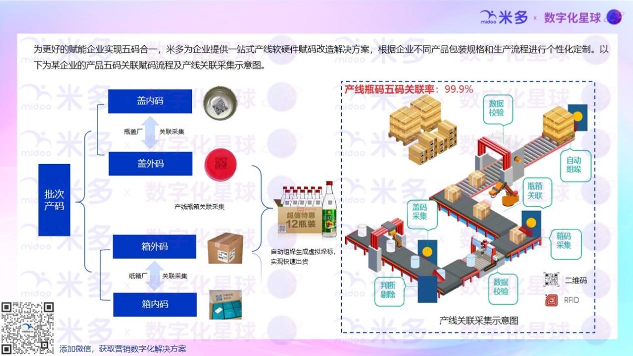 同时,细颗粒度数据也为精准营销提供了可能,品牌可以根据不同区域、不同门店的特点,实施“一地一策”的营销方案。 03五码合一:搭建全链路终端动销数据采集网络 1)以产品为媒介,数据采集触角延伸到一线动销 五码合一技术通过为产品赋予**数字身份,将数据采集触角延伸到销售一线,实现产品从生产到销售的全流程数据追踪,使品牌方能精准掌握产品在终端的销售动态。 过去品牌想要知道产品在终端的动销情况,只能等渠道的人工统计并层层上上报,而现在产品本身就是“数据采集器”,每经过一道环节就留下数字足迹。当产品在渠道流通时,基于渠道扫码动作,品牌就能得知这批产品的流通情况。