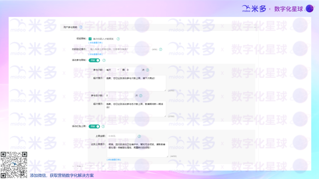 作为扫码系统服务商商,面对客户被羊毛党钻空子的问题,不能光让客户自己想办法,而是“系统为刃、服务为盾”,为客户提供“可落地、可震慑、可长治”的解决方案。 一、深入调查,精准定位漏洞根源 1.主动介入分析 处理这类问题,不能只听客户表面怎么说,还得深入现场,就像医生诊断按病因一样,彻底查明漏洞所在。 作为扫码系统服务商,应**时间派遣技术团队介入。不仅要依托系统本身的数据分析能力,还要结合客户的实际运营场景,从多个维度展开排查。比如,梳理扫码行为的时间分布是否存在异常集中,分析同一设备或账号的操作轨迹是否符合正常用户习惯,追踪不同扫码行为背后的网络环境、地理位置等关联信息。通过这种多维度交叉验证,才能穿透羊毛党制造的假象,准确锁定他们的攻击手法,为后续解决问题打下基础。 2.出具诊断报告 在全面收集数据的基础上,需要对海量的扫码日志、用户提交的信息、设备特征数据等进行深度挖掘和交叉比对,分析数据之间的内在关联,进而还原羊毛党的具体攻击路径和操作逻辑,最终形成一份详实的《羊毛党行为分析报告》,明确指向可能存在的漏洞的根源: 系统自身对“虚拟手机号”等虚假身份的识别能力不足? 客户设置的扫码频率限制阈值(如单设备每日扫码上限)过高或不合理? 中奖规则过于固定和可预测(例如特定时间段内高中奖率)? 还是活动设计本身存在缺陷,未能有效绑定真实消费场景? 3.责任界定清晰: 找到漏洞的根源之后,如果分析确认漏洞源于扫码系统本身的功能缺失(例如缺乏必要的活体检测验证手段),服务商应主动承担责任,明确告知客户,并将此功能升级纳入紧急产品迭代计划。 反之,若问题出在客户侧,例如系统本身已具备“设备指纹识别”等有效防护功能,但客户因各种原因未启用或配置不当,服务商则需明确指出这一疏漏,并提供详尽的技术指导,协助客户正确启用和配置相关功能,避免客户因“不会用”而错怪系统“不好用”。 二、强化系统,构建严密防护体系 1.系统性升级 找到漏洞只是起点,核心在于通过系统能力的实质性升级,从源头上压缩羊毛党的操作空间,让投机行为难以得逞。这就要求服务商将产品迭代作为重中之重,围绕前期识别出的漏洞类型,针对性地优化系统核心功能。