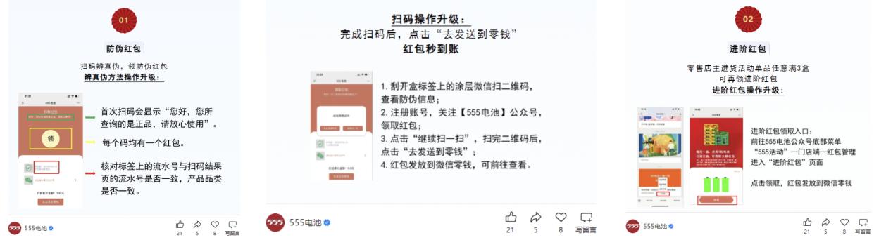 这种设计将维修师傅的工作行为与利益直接挂钩——每完成一次更换服务,就能获得即时回报,不仅提升了维修师傅推荐公牛电池的积极性,更在手机电池更换的专业场景中建立了品牌渗透。对维修师傅而言,推荐有激励的品牌既不影响专业判断,又能增加额外收入,自然更愿意主动推广。 ②零售门店端:南孚电池、555电池 对于直面消费者的零售门店店主,南孚和555的策略核心是防伪与利益捆绑。店主进货后,刮开包装盒密封处的防伪标签涂层,扫描二维码并按照步骤操作即可验证真伪(未关注公众号的则需要先关注公众号)。 验证成功的同时,还会有一笔小额红包即时到账。这既保障了渠道正规性,又让店主在进货环节就获得实际收益,极大增强了其销售正品的意愿。