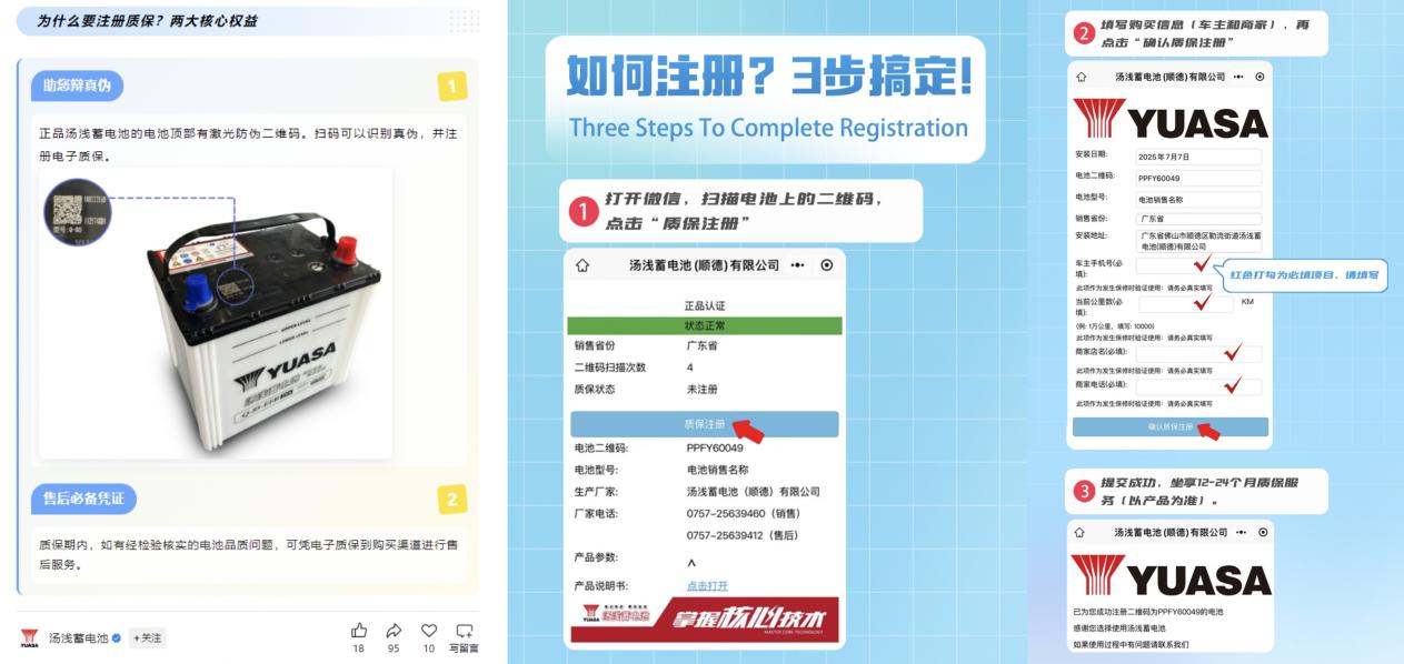扫码红包的惊喜制造让消费者在消费过程中获得了额外的价值感,从而在一定程度上提升了消费者对汇源电池的好感度和购买意愿。 在当下消费者对优惠和福利较为敏感的市场环境中,这样的活动能够有效地吸引消费者的注意力,促使他们有更换电池需求时在众多电池品牌中优先选择汇源电池。 ②质保码:汤浅电池 汤浅电池则采取了另一种形式的扫码活动,即通过扫码提供防伪验证和质保服务。当消费者购买汤浅蓄电池后,可扫描电池顶部的激光防伪二维码,在扫码验证真伪的同时还能注册电子质保。 注册成功后,消费者便能获得长达12-24个月的质保服务。从消费者角度看,这样的扫码活动为他们提供了更全面、更长效的售后保障。在购买电池这一耐用消费品时,质保期限的长短往往会影响消费者的购买决策。