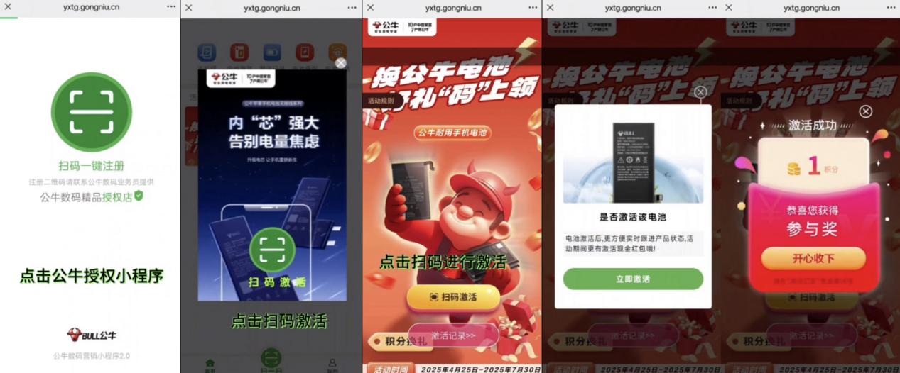公牛电池则聚焦手机维修场景,推出“换公牛电池,好礼码上领”活动。手机维修师傅在为消费者更换电池时,扫描电池上的激活二维码完成激活,就能获得积分奖励,且积分可直接抵扣货款。
