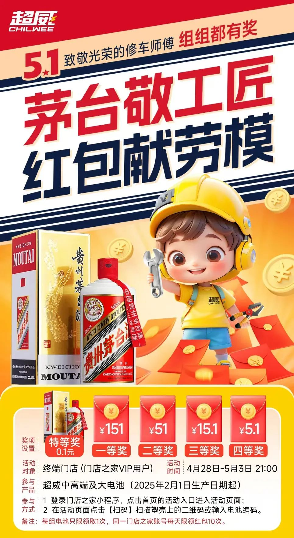 汤浅电池的这一扫码领取质保的设计,不仅让消费者感受到品牌对产品质量的信心,也让消费者在使用过程中更加放心,增强了消费者与品牌之间的信任关系。 而且,通过扫码注册质保的方式,品牌还能收集消费者的购买信息,便于后续的售后服务跟进以及与消费者保持更紧密的沟通联系,为品牌的长期发展和客户关系维护奠定基础。 2)终端门店扫码活动 ①服务型门店端:超威电池、公牛电池 在电池销售的链路中,维修师傅这类“关键意见销售者(KOS)”往往扮演着隐形决策者的角色,超威和公牛显然深谙此道,将扫码活动精准瞄准了服务型门店的维修师傅。 超威电池在五一期间推出的“茅台敬工匠,红包献劳模”活动,专门针对修车师傅设计:符合条件的门店用户通过“超V门店之家”小程序进入活动页面,扫描电池塑壳上的二维码或输入电池编码,就能领取红包或茅台酒奖励。 这类活动巧妙地将节日情感与物质激励结合,既贴合“工匠”身份的荣誉感,又用高价值奖励激发参与动力。
