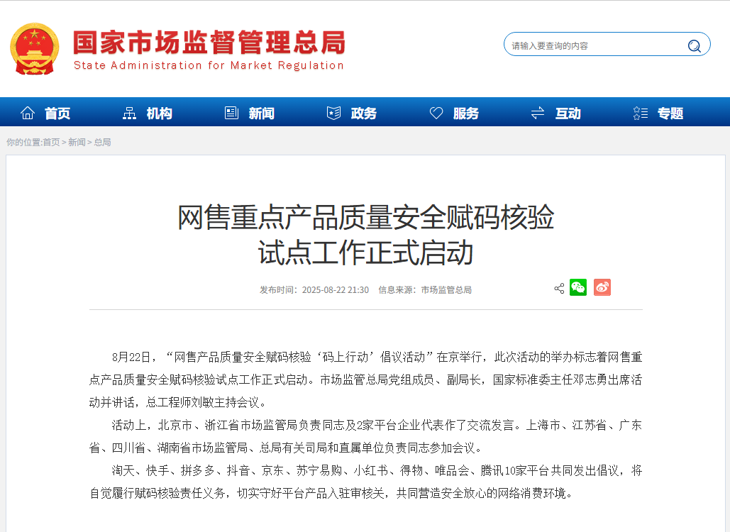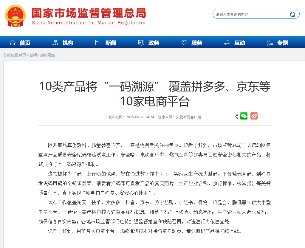 (图片来源:互联网) 未赋码或核验不通过的产品,根本无法正常上架销售。此时若能提前对接符合国家要求的赋码系统,就能抢在竞品前稳住线上销路,而不是等平台拦截后再紧急整改。 2.试点的核心目标:解决网售痛点,构建全链路监管 赋码核验的本质是通过“生产源头赋码、平台验码亮码、消费者识码用码”的全链条机制,破解网络销售中假冒伪劣、货不对板等问题。 对企业来说,这既是合规要求,也是规范自身生产销售流程的契机。通过赋码,产品实现“来源可查、去向可追”,后续出现质量问题时,企业能够快速定位责任环节,有效减少纠纷和损失。 这一机制的建立推动形成政企协同、社会参与的质量共治体系,切实增强消费者安全感。 二、品牌商如何应对变局 1.优先进行合规评估 先做产品与渠道自查。企业需先明确自身生产的产品是否在10类重点产品范围内,可对照试点清单核对。 其次需评估合规时间表和要求:不同省份的试点推进节奏略有差异,广东、山东等首批试点省份的企业,需在3个月内完成核心产品赋码,其他地区企业虽有缓冲期,但也应提前规划,避免因信息滞后而陷入被动。 2.选择适合的技术方案 根据产品特性和成本预算,选择既能满足合规要求,又具备营销扩展能力的赋码解决方案。方案应具备灵活性,能够适应不同平台的要求。 许多企业担心如果提前做了赋码系统,与后续国家政策不符还需要重建。实际上,政策支持企业将已有的追溯防伪系统进行升级对接,只要能够达到国家要求的核验标准即可。 1)快速对接,现有系统不用重建 选择解决方案时,需要重点考察其是否具有快速对接能力,能否与企业现有ERP、SCRM、防伪系统进行对接;编码规则是否符合国家标准转,将来无需推倒重建,**限度保护企业原有投资。