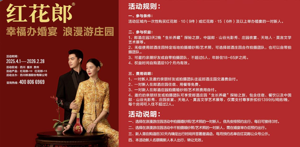 针对四川、重庆、贵州的婚宴市场,郎酒推出“幸福办婚宴,浪漫游庄园”增值服务,购买指定数量红花郎的新人可获郎酒庄园3天2晚体验,包括光影秀、庄园夜宴、莫言文学展等,并免费使用场地拍摄婚纱照。