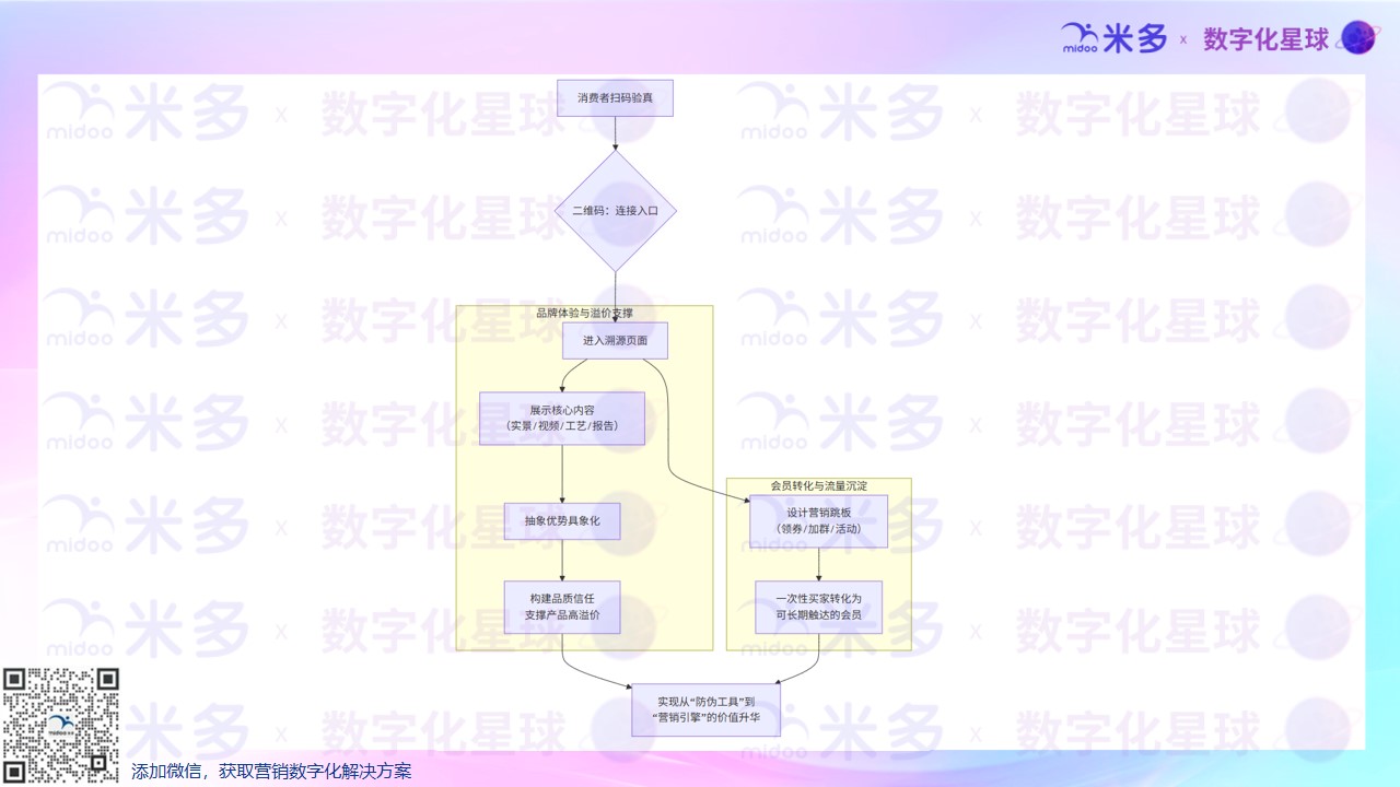 04总结:趋势已至,用“码”开启品牌价值守护与增长的新篇章 对于高价值的区域特色产品而言,产区赋码溯源已不是一道选择题,而是一道生存题和发展题。它不仅是打击假货的“盾”,更是提升品牌声誉、连接消费者、挖掘数据价值的“矛”。 当信任成为最稀缺的资源,谁能率先用科技手段将其“码”上兑现,谁就将在下一轮市场竞争中占据主动权。对于志在赢得未来的品牌而言,现在要思考的不是“做不做”,而是“如何做得更快、更体系化”,从而将潜在的信任危机,转化为稳固的竞争壁垒。 您的品牌,准备好为这份信任“赋码”了吗? 参考资料: [1] 黑龙江省标准技术创新协会《五常大米溯源防伪体系管理规程》(T/HBJC009—2025) [2] 仁怀市酒业协会《中国酱香白酒核心产区(仁怀)认证赋码管理办法(试行)》 [3] 元生昌五常大米官方体验店《五常大米年产105万吨,市场年销售1000万吨!?你买的是真五常米吗?》 关于米多 米多公司成立于2014年,是国内领先的营销数字化整体解决方案提供商,在营销领域致力于以企业业务能力(EBC)为核心,构建基于“立体连接、数据共通、流量共享、全景共鸣、全域赋能、全链共赢”的产业互联网营销服务平台,赋能企业通过“网络协同”和“数据智能”双螺旋引擎,用数字化驱动业务增长。累计服务酒类行业、快消行业、日化家清行业、化工建材行业、茶叶行业等品牌类企业逾3000家,包括茅台、可口可乐、宝洁、高露洁、维达、立白、雪花啤酒、劲牌、绿箭、嘉士伯、美涂士、华新集团等。 如想获取“营销数字化解决方案”,请私聊我~ 声明:此篇为米多公司的原创文章,转载请标明出处。链接:https://www.ebcone.com/sys-nd/264.html