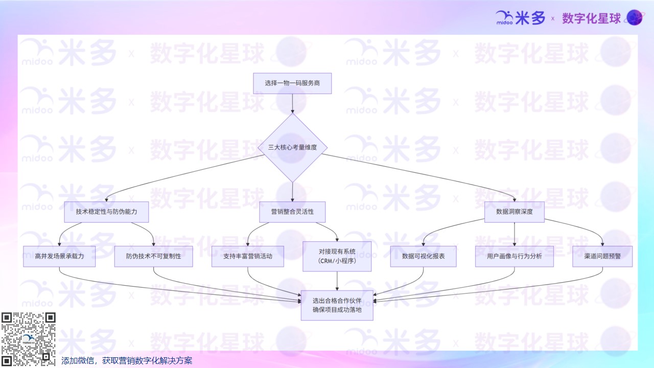还要考虑自身资源能力:团队技术实力够不够维护系统?预算能支撑多少投入?不用一开始就追“***技术”、一次性搞自建,可从当下主流的一物一码溯源做起、采用SaaS系统快速部署上线,后续再根据需求、效果决定是否要调整。 总之,战略评估核心是“找准定位”,按自身情况定方案,不盲目照搬。 2)选择合作伙伴的关键考量 大部分品牌的溯源体系落地要靠专业一物一码服务商。选对服务商能少走弯路,选错可能遇系统崩、数据丢、防伪差等问题,影响品牌形象。选服务商要重点看三维度:技术稳定性与防伪能力、营销整合灵活性、数据洞察深度。