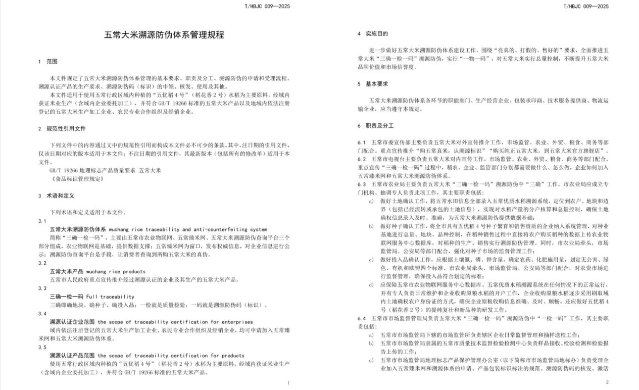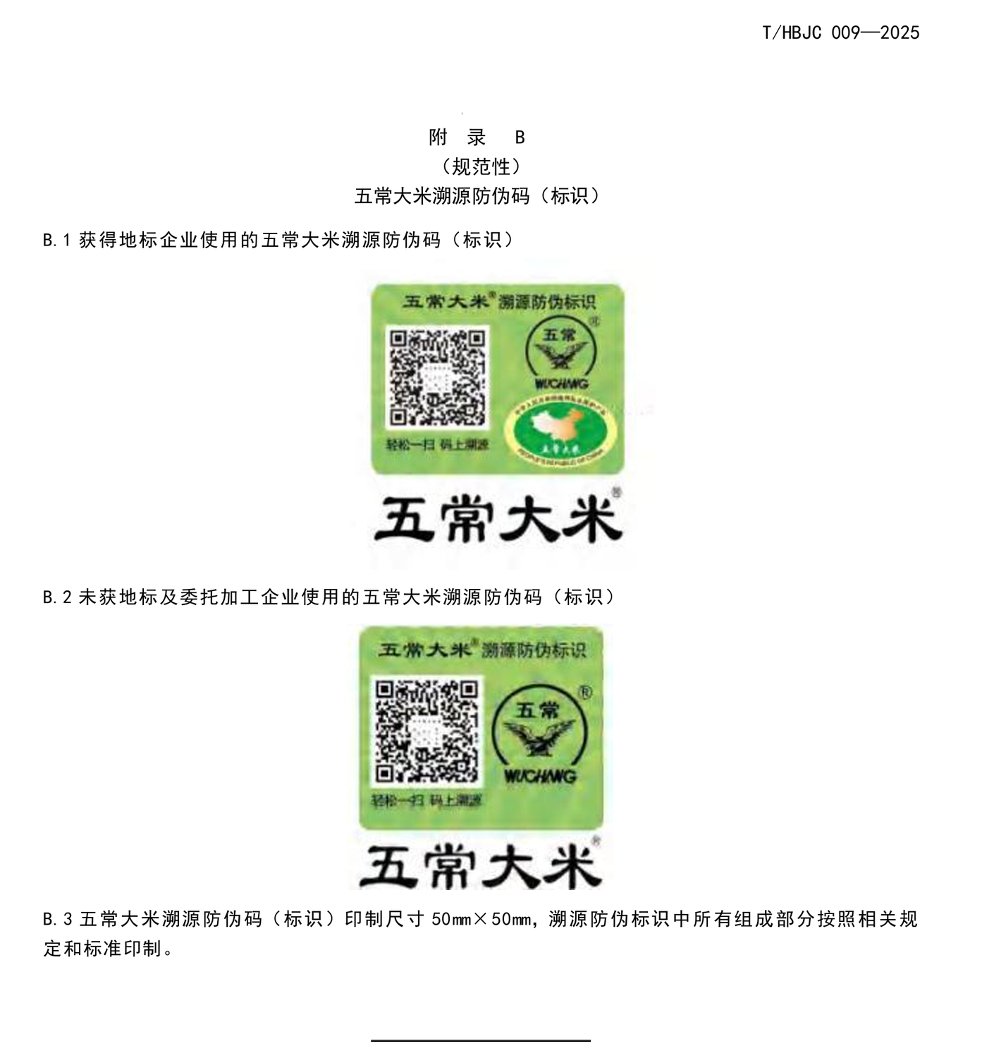 《五常大米溯源防伪体系管理规程》(T/HBJC009—2025)附录B 其次想:我的品牌故事能否靠溯源变具象可信?每个区域品牌都有特色,比如“山泉灌溉”大米、“古法酿造”酱酒,但靠包装文字难让消费者有印象。 要考虑怎么用溯源码“展现”特色,比如“山泉灌溉”可加山泉视频、水质报告;“古法酿造”可展传统工具、流程时间线。把抽象故事变看得见、可验证的信息,消费者更易信、易记。