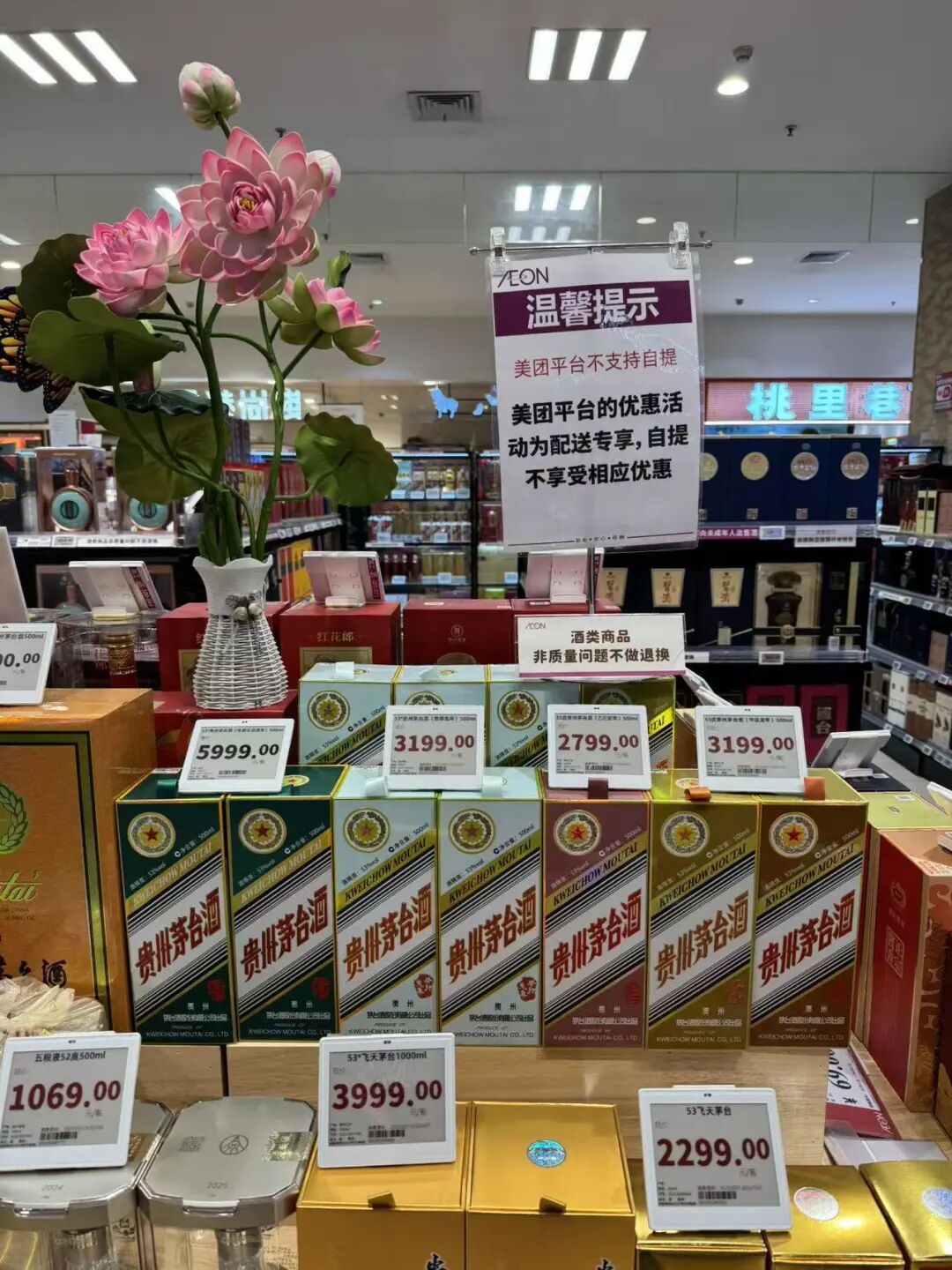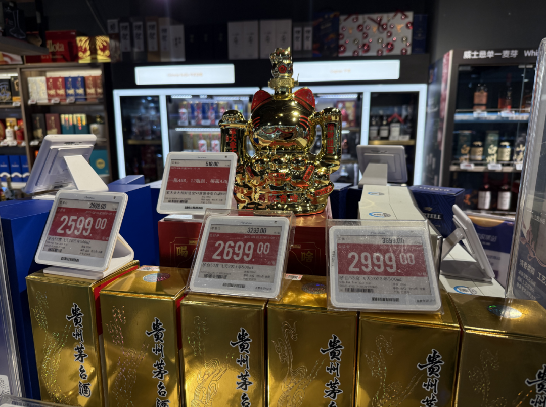 (广州市区商超酒水堆头。时代周报记者摄) 美团数据显示9月下旬某单日白酒品类销量同比增长超5倍,茅台、五粮液等名酒单日成交额均破千万元。 有烟酒店长反映,顾客常常线下看货、线上比价,尽管对电商平台的真伪有顾虑,但线上低价仍然对实体经营造成压力。 二、市场寒意中的数字化布局者 走进华东某省会城市的大型商超酒水区,传统白酒货架前顾客稀少。这种冷清场景,正是今年双节前酒水市场的真实写照。库存压力如同悬在经销商头上的利剑,而价格倒挂与市场分化,则让这份“寒意”更甚。