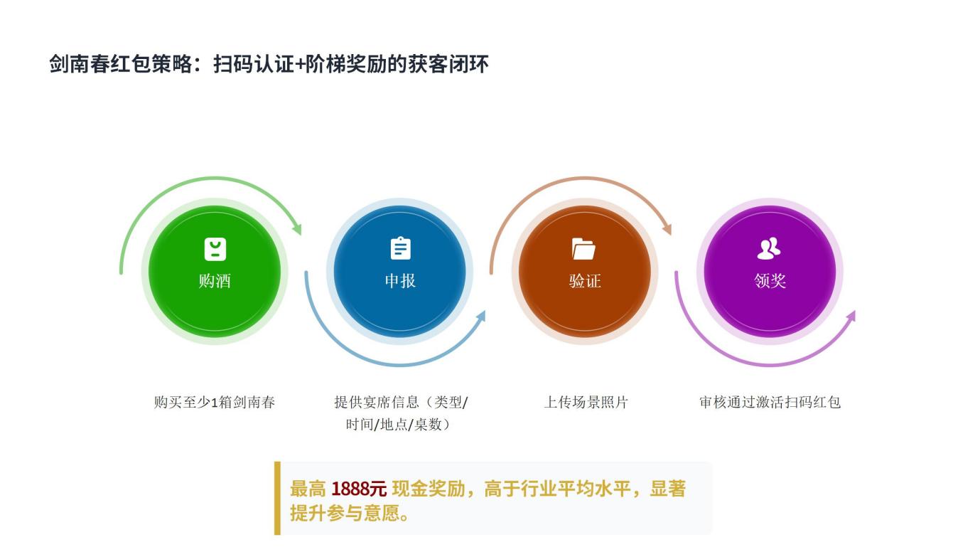 二、剑南春红包策略拆解:1888元如何换得精准办席信息? 1.策略核心:“扫码认证+阶梯奖励”的获客闭环 剑南春以“盖内码红包”为核心,构建从信息收集到场景验证的完整途径。消费者购酒1箱即可参与活动,需先向合作门店提供办席相关信息,包括宴席类型、举办时间、地点、预计桌数,同时上传包含宴席场景、用酒摆放的现场照片,完成认证后才能激活扫码红包功能。品牌方审核时,会重点核查照片的真实性,确保场景与申报信息一致,避免虚假认证。 红包金额设置上,最高1888元的大额奖励并非随机设定,而是基于前期市场调研。数据显示,办席主家对现金奖励的敏感度高于实物礼品,且1888元的金额高于行业平均水平,能有效提升参与意愿。