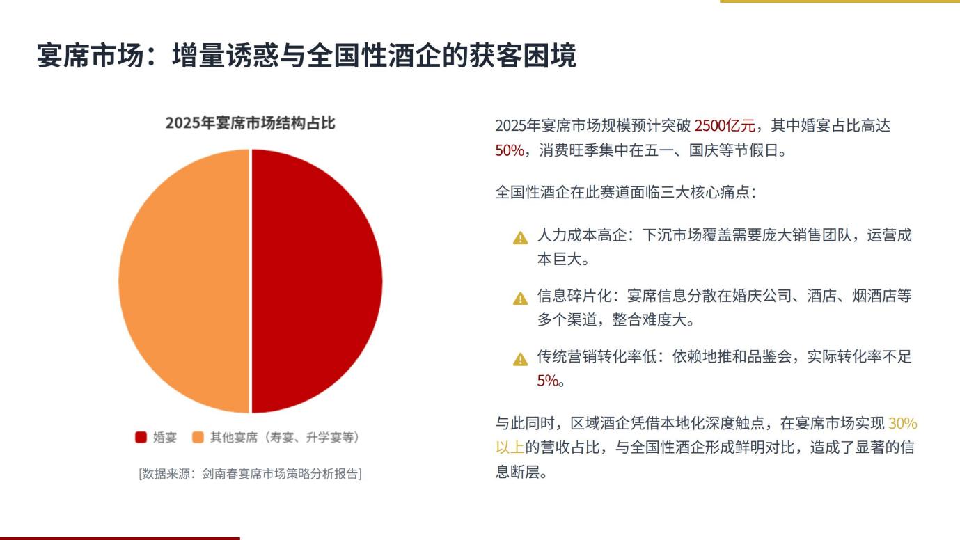 一、宴席市场的增量诱惑与全国性酒企的获客死局 1.2025年宴席市场的核心价值与竞争态势 2025年“双春年”叠加传统婚育高峰,直接带动各地酒店婚宴预定量增长,部分人口密集城市的热门酒店旺季档期需提前3个月预订。但市场红利背后,行业内卷持续加剧,行业开瓶率普遍不足50%,导致酒企实际动销率低于销售数据,库存周转压力增大。 从市场结构看,婚宴占宴席市场总规模的50%,且具有明显的季节性特征,五一、国庆等假期为消费旺季,酒企需在旺季前2个月启动备货与营销筹备,以应对集中需求。 2.全国性酒企的获客痛点与信息断层 区域酒企凭借本地化优势,能通过社区合作、酒店驻点、便民服务等方式,高效捕捉升学、婚庆、寿宴等办席需求,部分区域酒企婚宴渠道营收占比超30%。而全国性酒企面临三重难以突破的障碍: 一是地域覆盖广导致的成本困境,若复刻区域酒企的“人海战术”,需在全国范围内新增数万名业务员,人力成本激增,超出企业承受范围; 二是办席信息分散在多环节且互不互通,除婚庆公司、酒店外,社区居委会、宴会厅预订平台、亲友推荐等均为信息来源,每个环节的信息碎片化,缺乏统一整合入口; 三是消费理性化下,传统营销模式失效,此前依赖的广告投放、线下促销等方式,转化率普遍低于5%,大量营销资源被浪费。 对比来看,区域酒企能通过业务员一线走访收集办席信息,而全国性酒企因缺乏本地化触点,难以对接这些分散的信息环节,形成明显的信息断层。