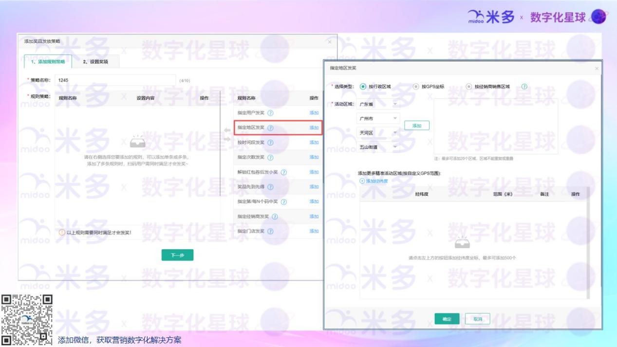 添加指定地区发奖,并选定发奖地区,操作和场景1一致,可按行政区域、GPS坐标、经销商销售区域锁定发奖范围。