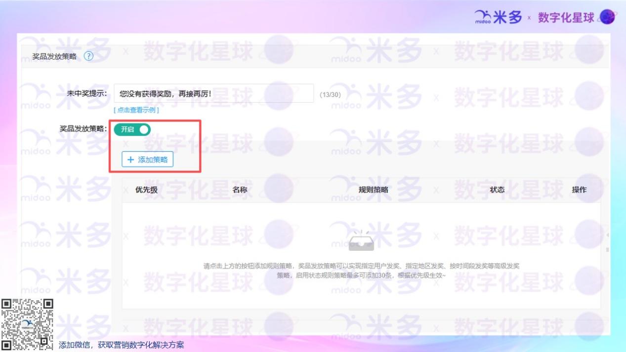 ③区域专属奖项设置,进入“活动策略”,选择“奖品发放策略”,点击“新建策略”(若有历史策略也可根据需求直接复用)。