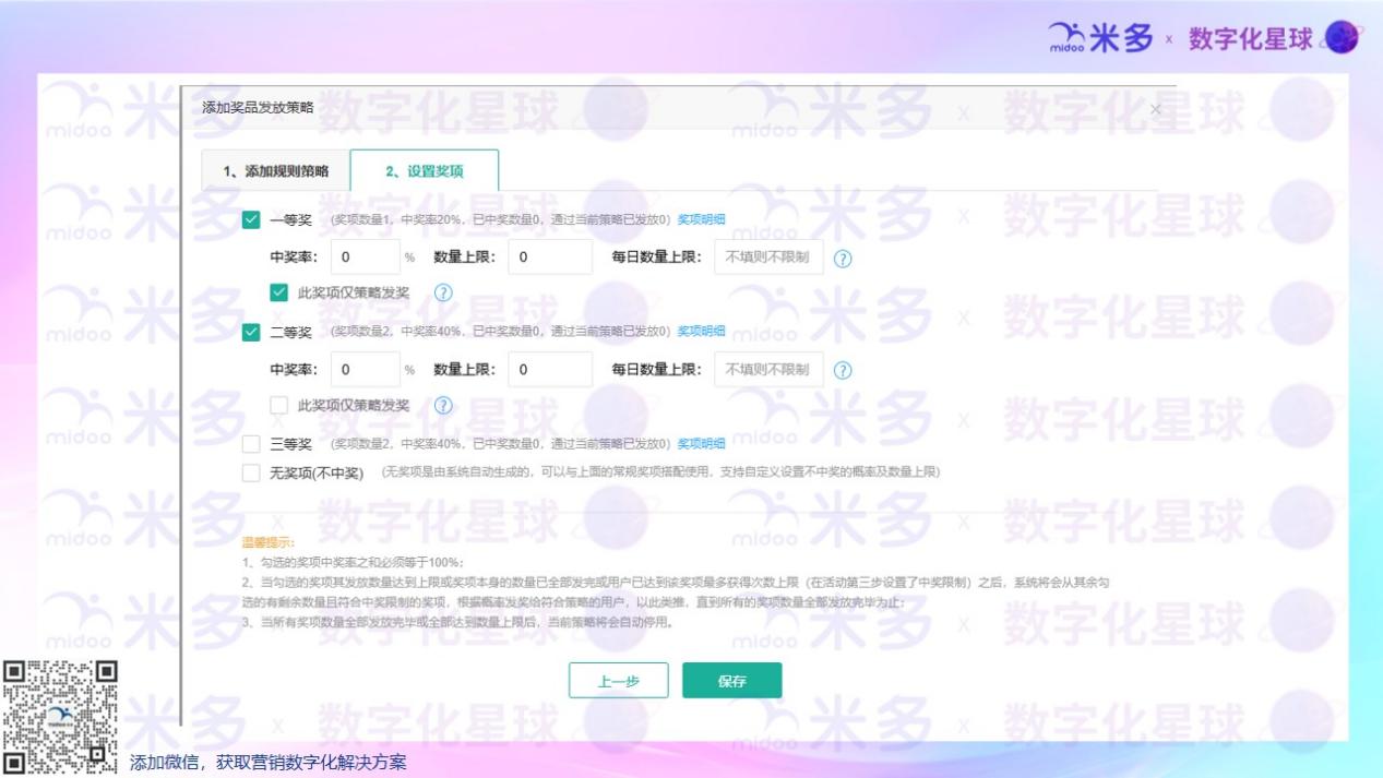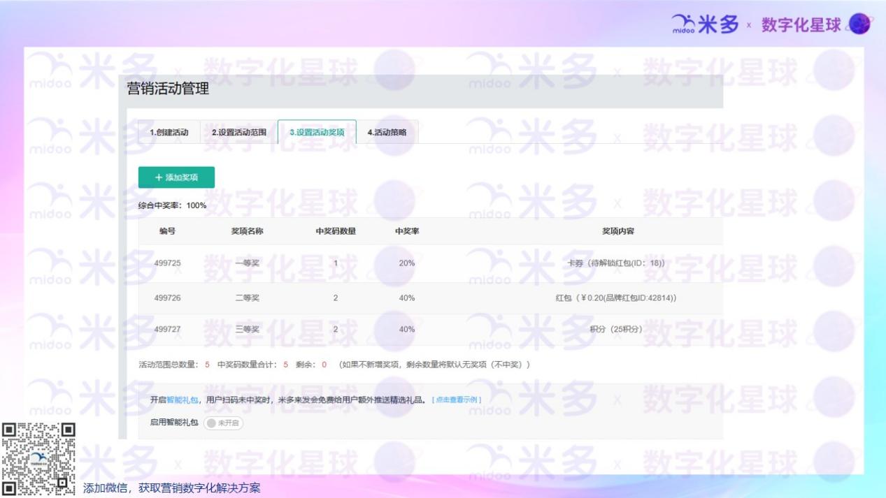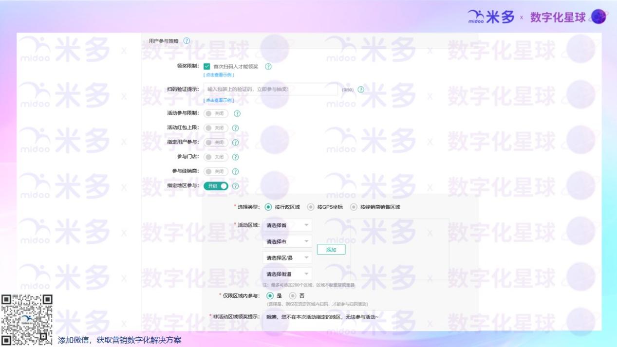 **种是按行政区域定位,目前能精准到“省—市—区/县—街道”,比如你想重点覆盖广州的五山街道,就可以直接选择“广东省广州市天河区五山街道”,只有身处这个街道范围的消费者扫码,才能参与活动,实现营销区域的高精准度。 第二种是按GPS坐标定位,支持自定义GPS、门店GPS等,设置时可以指定单个或多个GPS地点的辐射范围,比如以某家超市为中心,半径500米内的消费者扫码才能参与,这种方式适合想拉动线下终端客流的场景。 第三种是按经销商销售区域定位,品牌可以根据需求选择某个或多个经销商的销售区域,系统会自动匹配商品归属的末级经销商区域,只有该经销商负责区域内的消费者扫码,才能参与活动。 场景2:活动部分奖项**特定地区:差异化设奖,匹配区域需求 当品牌想做全国统一活动框架,同时要满足不同区域的差异化需求,比如全国消费者都能参与“扫码赢好礼”,但针对北方加设暖冬礼盒,针对南方加设防晒礼包。 这种情况下,就可以通过“奖品发放策略”来设置,这种模式既能保证品牌营销的统一性,又能满足不同区域的消费偏好。具体操作如下: ①先完成活动基础设置,和场景1一样,先在“智能营销”模块创建活动,设定好活动名称、时间和参与产品范围。 ②奖项创建,提前创建好奖项,包括两类:一类是全国消费者都能抽的基础奖项,另一类是针对不同区域的专属奖项,提前创建好才能后续绑定。