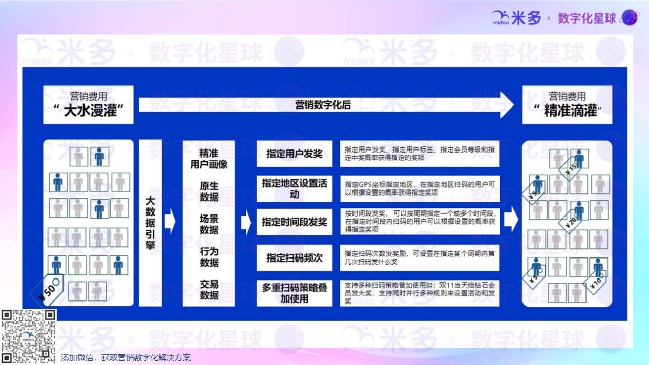 2)降低资源浪费:预算向高价值区域倾斜 有了指定地区发奖功能,品牌不用再把预算平均分配到所有区域,而是可以根据区域的市场价值,把预算集中投放到高潜力区域,避免非核心区域、无效区域稀释资源,让每一分预算都用在能出效果的地方,减少浪费,提升整体营销ROI。 3)数据可追溯:清晰掌握区域效果,优化策略闭环 活动启动后,可基于系统采集的活动数据统计不同区域的“参与率、奖项核销率、动销增长率等系统,进而通过这些数据清晰看到每个区域的活动效果,形成“数据反馈—策略调整—效果提升”的闭环,让后续营销越来越精准。 关于米多 米多公司成立于2014年,是国内领先的营销数字化整体解决方案提供商,在营销领域致力于以企业业务能力(EBC)为核心,构建基于“立体连接、数据共通、流量共享、全景共鸣、全域赋能、全链共赢”的产业互联网营销服务平台,赋能企业通过“网络协同”和“数据智能”双螺旋引擎,用数字化驱动业务增长。累计服务酒类行业、快消行业、日化家清行业、化工建材行业、茶叶行业等品牌类企业逾3000家,包括茅台、可口可乐、宝洁、高露洁、维达、立白、雪花啤酒、劲牌、绿箭、嘉士伯、美涂士、华新集团等。 如想获取“营销数字化解决方案”,请私聊我~ 声明:此篇为米多公司的原创文章,转载请标明出处。链接:https://www.ebcone.com/sys-nd/270.html