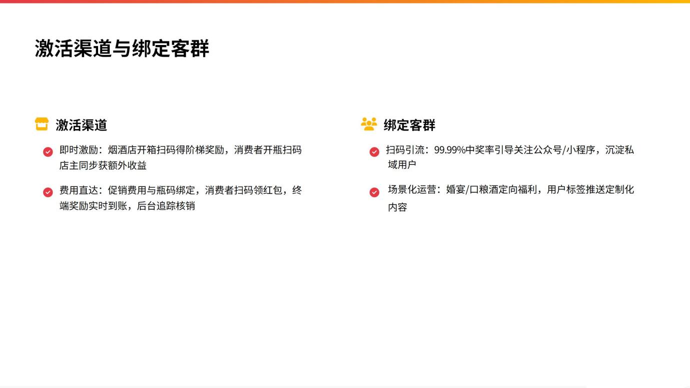 二、激活渠道动力:从“压货”到“主动推货”的转变 1.即时激励:让烟酒店老板愿意推 将终端激励与扫码直接挂钩,企业可设计阶梯式开箱奖励:烟酒店扫码开箱,满10箱可获50元奖励,满20箱获120元,满50箱获350元,奖励额度随开箱数量递增;消费者开瓶扫码时,系统会自动按比例拆分奖励,比如消费者领取10元红包,店主同步获得3元收益,且奖励实时到账微信零钱,支持无门槛提现。 这种“卖一瓶赚一份”的即时反馈,比传统季度结算的返点更具吸引力。传统返点需等3-6个月,店主资金周转压力大,而即时激励能快速兑现收益,直接提升终端主动推荐的积极性,尤其适合中小烟酒店对短期收益的需求。 2.费用直达:杜绝促销费“层层截留” 传统促销中,费用从厂家到消费者需经过经销商、二批商、终端三层流转,每层都会截留20%-30%,最终仅28%的优惠能触达消费者。“一物一码”则将促销费用与瓶码内置参数绑定,消费者扫码后,系统自动匹配奖励规则,红包、优惠券直接发放至消费者账户,终端奖励同步到账,全程无中间环节。 品牌方通过后台可实时追踪费用核销数据,包括已核销金额、未核销瓶数、终端领取率等,还能设置“未扫码不结算”规则:若终端未引导消费者扫码,对应的奖励不予兑现,防止虚假核销,确保每笔促销投入都能精准作用于终端与消费者,避免费用流失。