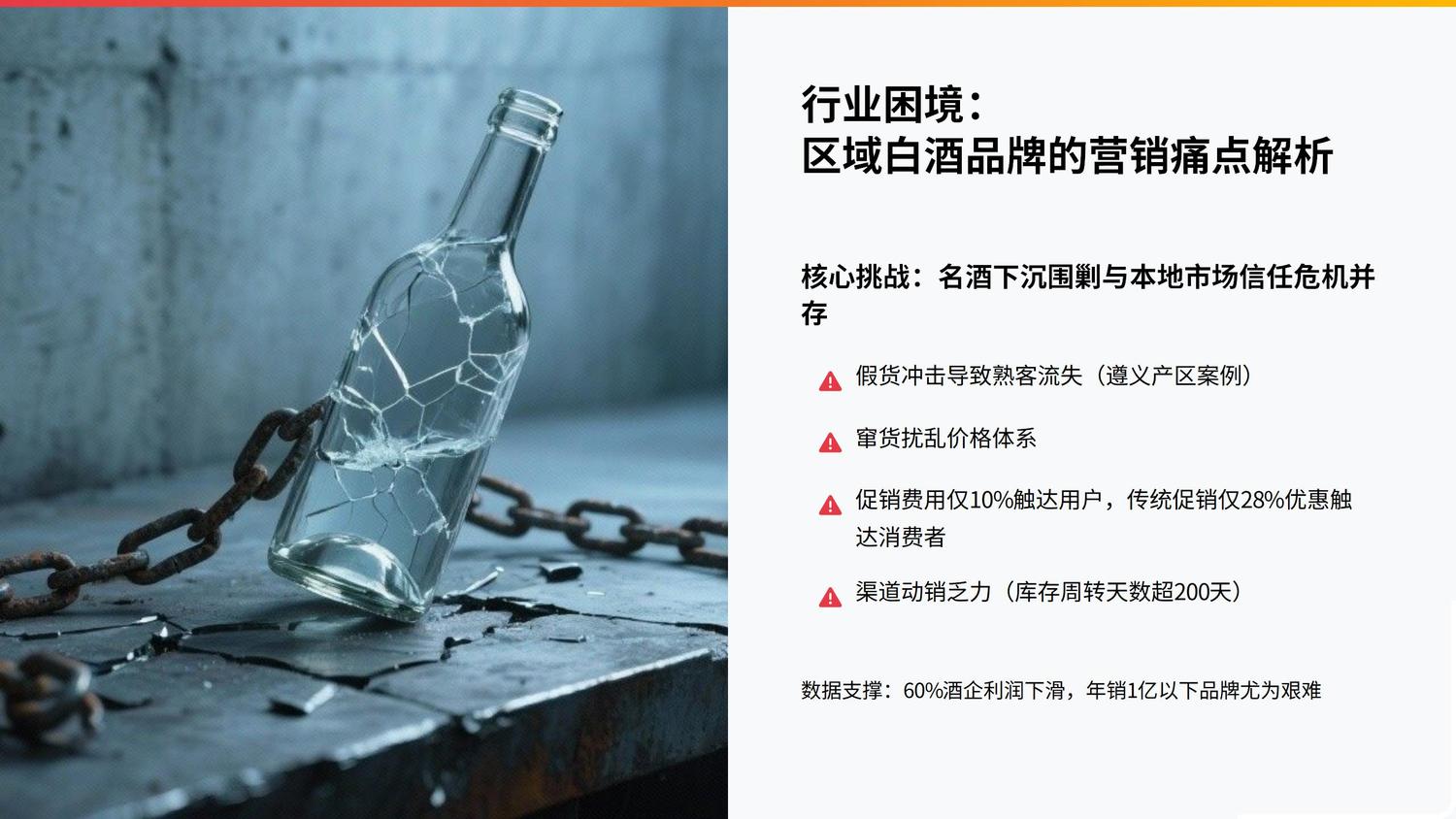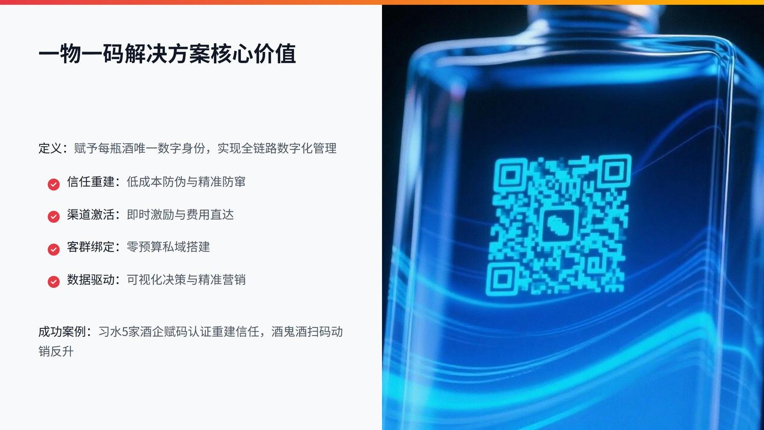 货压渠道、假货捣乱、促销白扔钱?年销1亿以下白酒营销总监,“一物一码”帮你抓牢本地生意2025年白酒行业中期报告显示,60%酒企面临利润下滑,年销1亿以下的区域品牌更陷入两难:一边是名酒下沉围剿,一边是本地市场“熟人信任”被假货、窜货冲击,渠道动销乏力、数据断层成致命伤。遵义产区多家酒企因假货流失熟客,某区域酒企500万促销费实际触达用户不足10%,经销商库存周转天数超200天。而习水5家酒企靠赋码认证重建信任,酒鬼酒借扫码实现动销反升,证明“一物一码”并非巨头专属。这把数字化钥匙,正成为区域品牌守住本地基本盘的关键。