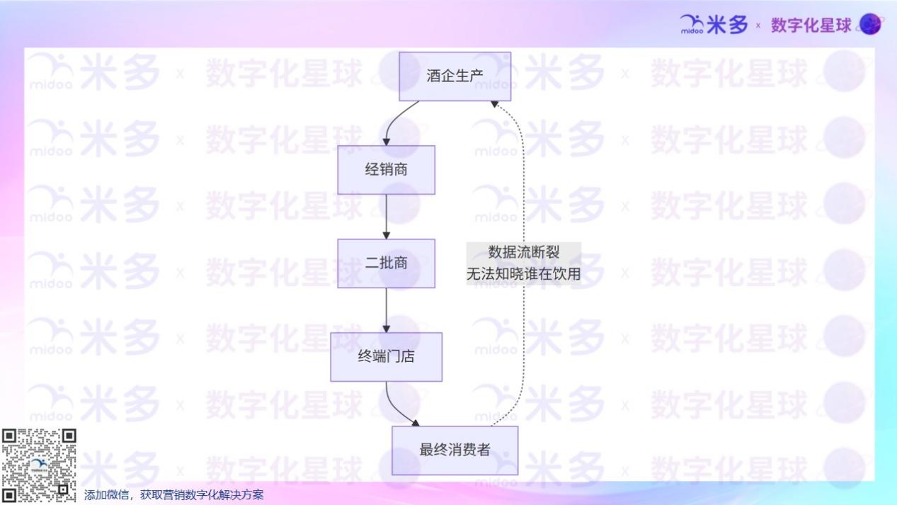 这种“用户零距离”的运营模式,让传统酒企层层分销的体系显得格外笨重。 02传统酒企的翻身困局:不是缺好产品,而是缺“触达用户的能力” 1)数据黑洞:看不见的消费者 传统酒企**的痛点在于,产品从出厂到最终消费的整个链条中,企业如同在黑暗中摸索。一瓶酒从生产线出发,经过经销商、二批商,再到终端门店,最终到达消费者手中,这个漫长过程中品牌完全不知道最终是谁消费了这瓶酒。