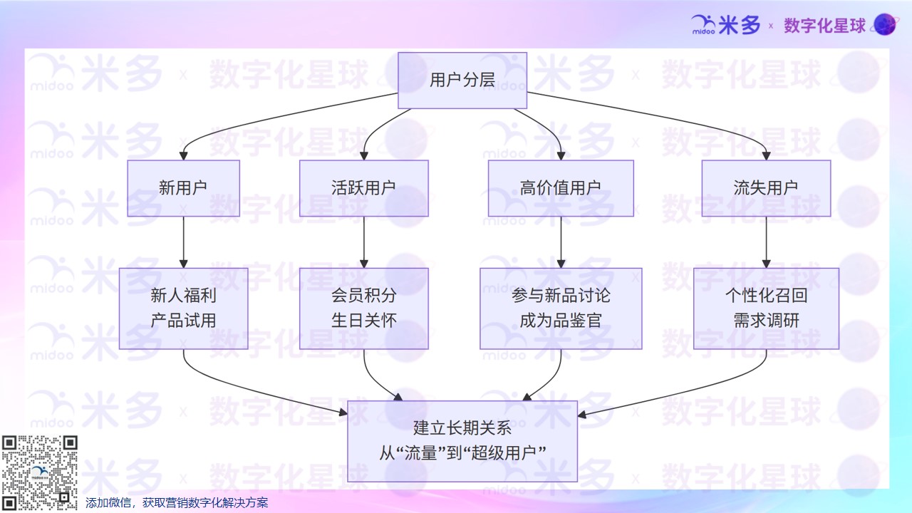 这种完整的用户视图,能让品牌真正“认识”自己的用户,为后续的精准营销、个性化服务奠定坚实基础,避免数据沉睡,让每一条数据都能为决策服务。 2)实现全生命周期价值管理(LTV),让用户“贵”起来 基于CDP的用户视图,酒企可以对用户进行分层运营,实现全生命周期价值管理(LTV),让每一位用户的价值**化。 比如,将用户分为新用户、活跃用户、高价值用户、流失用户: