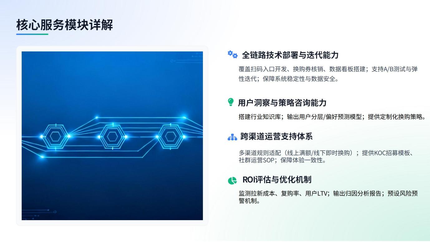 **层:用户身份打通:从匿名流量到会员资产 这一层的核心是打破用户“匿名状态”,将线下扫码用户转化为可识别、可运营的会员,为后续动作奠定基础。 建立身份关联:通过换购活动引导用户注册会员,打通线下扫码数据(消费地点、时间)与线上会员信息(基本资料、偏好标签),形成统一的用户ID。 构建立体用户画像:基于身份关联数据,补充用户消费频次、换购品类等行为标签,形成包含“基础信息+行为偏好”的立体画像,避免后续运营“无的放矢”。 沉淀会员资产:将匿名流量转化为会员后,用户不再是“一次性参与者”,而是品牌可长期触达、持续运营的核心资产,为复购转化提供前提。 第二层:场景化链路设计:串联消费与社交场景 基于会员数据,设计“消费-换购-分享-再消费”的闭环链路,实现用户自传播与多场景渗透。 打通多渠道数据:确保小程序、电商平台、线下门店的换购规则、用户数据实时同步,避免用户在不同渠道体验割裂,提升参与连贯性。 设计社交分享机制:用户完成换购后,系统自动生成个性化分享物料,邀请好友参与可解锁阶梯式权益(如额外换购资格、积分奖励),通过社交裂变扩大活动覆盖。 积累行为数据:链路运行中,同步采集用户分享频次、多渠道消费轨迹等数据,与会员基础画像融合,形成更完整的用户数据资产,为第三层“数据反哺”提供支撑。 第三层:数据反哺策略:从用户行为到业务决策 整合前两层积累的用户的数据,反哺产品研发、库存管理与营销策略,实现“数据驱动增长”。 分析品类偏好:基于换购数据,识别不同区域、季节的用户偏好(如南方夏季偏好清爽型换购品、下沉市场偏好高性价比换购品),指导产品研发方向。 优化库存布局:结合换购核销数据与销售数据,预测不同区域的产品需求,动态调整库存分布,避免断货或积压风险。 调整营销动作:针对不同用户分层(如高频换购用户、首次换购用户),设计差异化营销活动,提升营销精准度与转化率。 三、数字化服务商必备的四大核心服务模块 bC一体化的三层落地,需依赖数字化服务商的技术、运营与数据能力支撑。品牌筛选服务商时,需重点评估其是否具备以下四大核心服务,需重点评估其是否具备以下四大核心服务,同时关注成立时间、案例积累与响应效率,避免技术断层、运营低效等问题。