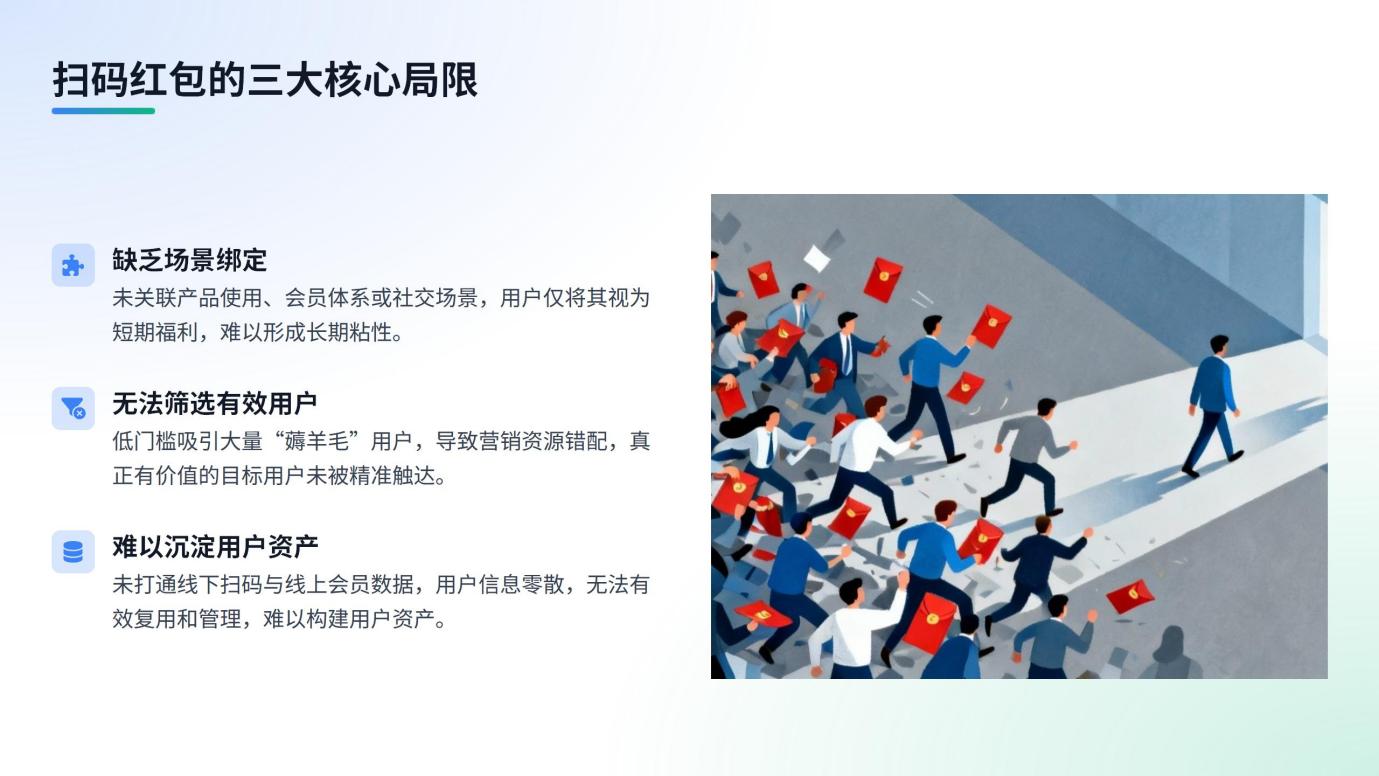 本文将以N元换购为切入点,剖析如何通过数字化工具将一次性促销转化为持续用户关系,并拆解优质服务商必备的四大服务模块,为品牌破解增长瓶颈提供可落地方案。 一、扫码红包的失效根源与N元换购的价值重构 在流量成本高企、用户注意力分散的当下,传统扫码红包的增长逻辑已逐渐失效,而N元换购凭借对“消费绑定”与“用户筛选”的精准把控,成为品牌链接b端与C端的新支点。 1.扫码红包的三大核心局限 扫码领红包是企业营销数字化进程中初期的选择,其核心是为企业建立与消费者最基础的联系。 缺乏场景绑定,用户认知偏差:红包活动未与产品使用、会员体系或社交场景关联,用户仅将其视为“短期福利”,而非与品牌互动的入口,活动结束后即回归“匿名状态”。 无法筛选有效用户,资源浪费:红包无消费门槛或低门槛特性,吸引大量“薅羊毛”用户,这类用户既无复购意愿,也无法为品牌提供有价值的行为数据,导致营销资源浪费。 难以沉淀用户资产,增长断层:红包活动未打通线下扫码与线上会员数据,用户信息零散且无法复用,无法形成持续运营的用户池,后续营销动作只能“从零开始”。