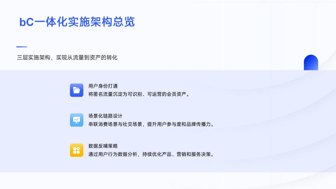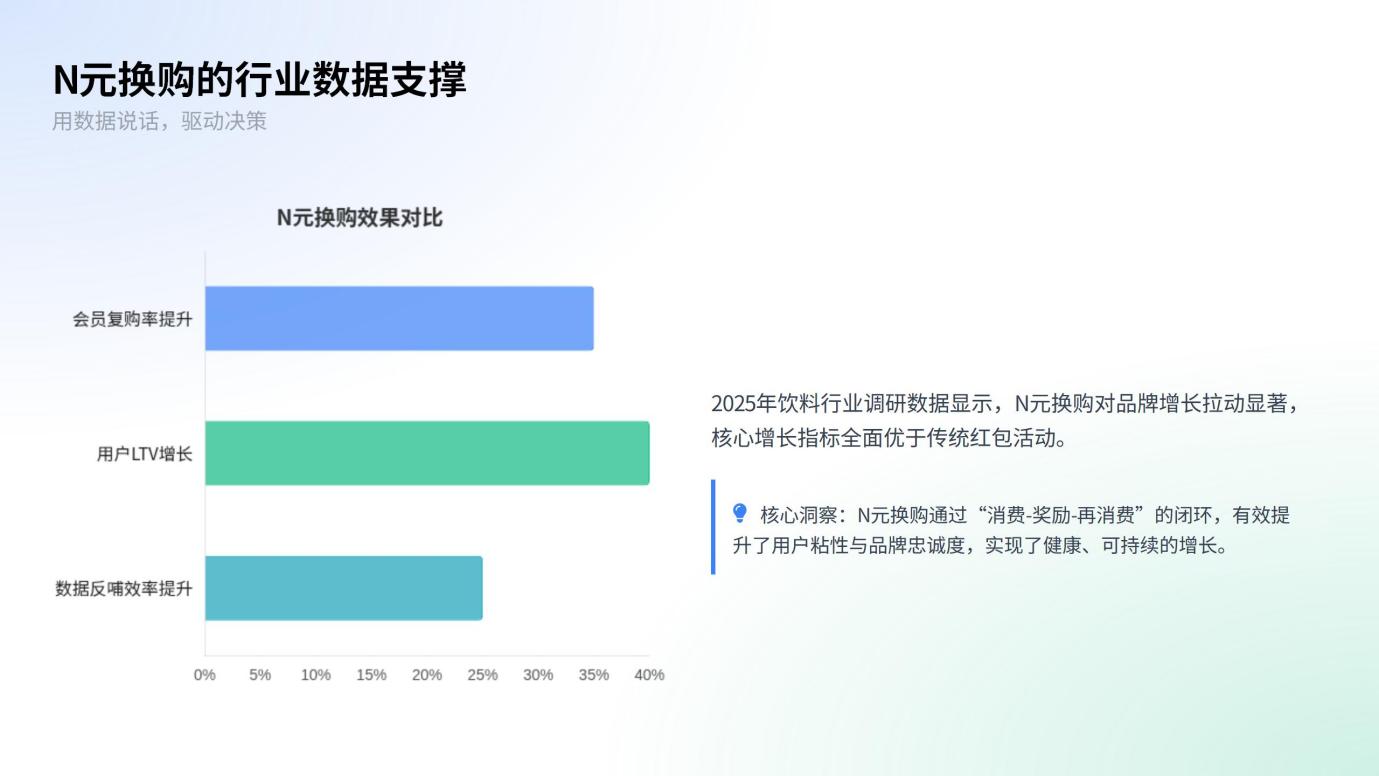 3.N元换购的行业数据支撑 2025年饮料行业调研数据显示,N元换购对品牌增长的拉动效果显著: 会员复购率提升35%:采用N元换购的品牌,其会员复购率较单纯红包活动高出35%,核心原因在于换购筛选出的用户更具消费粘性。 用户LTV显著增长:通过换购行为识别的高价值客群,其生命周期价值(LTV)较普通用户提升40%,成为品牌稳定的收入来源。 数据反哺效率提升:基于换购偏好的数据分析,品牌产品研发与库存调整的准确率提升25%,减少因供需错配导致的资源浪费。 二、bC一体化落地的三大实施层级:从流量到资产的转化 N元换购的价值并非孤立存在,需通过bC一体化的三层落地动作,实现“用户-场景-数据”的联动,将一次性促销转化为持续增长的动力。