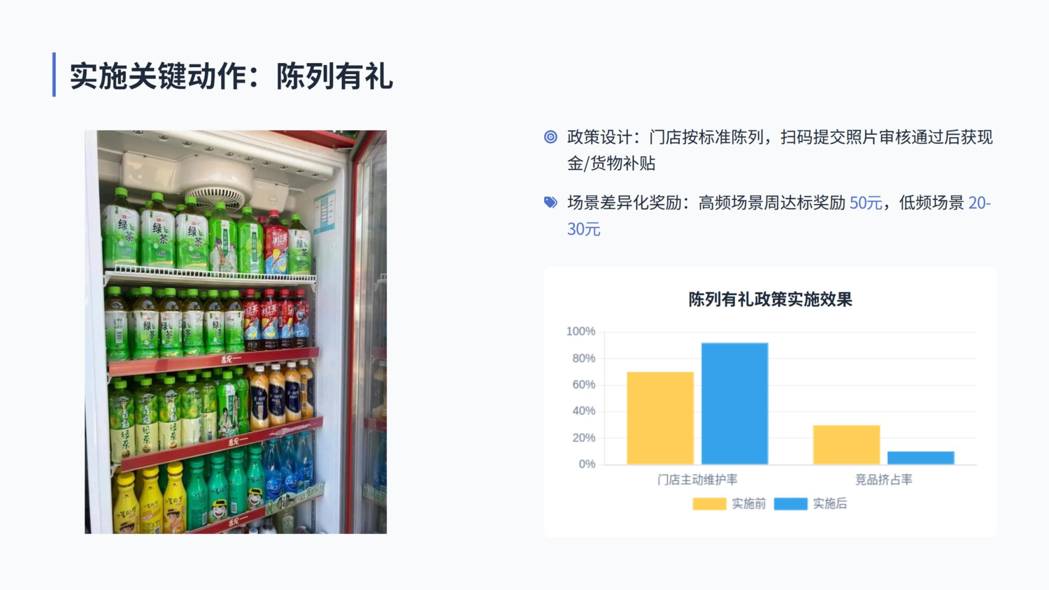 2.数据驱动补货:AI模型实现“提前备货” 统一以扫码获取的动销数据为核心,搭了“终端扫码-库存可视-智能补货”的全链路体系,还引入AI模型优化补货决策。这个模型不只是看动销数据,还会结合气象信息、节假日、区域活动等变量:比如高温天扫码量会日均增25%,就把补货频次从2天1次改成1天1次;学校周边门店开学前,补货量会提前1周提高30%。 在试点区域,这个模型的效果很明显:补货准确率从原来的65%提升至90%,核心终端的缺货天数从每月4天减少到1天,单店月销量平均增加1500元。而且经销商也省心:以前要靠经验猜“该补多少”,现在系统会直接给指令,不用再担心补多了压库存,补少了断货。 3.陈列有礼强绑定:阶梯奖励激活门店主动维护 在200元每台的投放激励基础上,统一还搞了“陈列有礼”的阶梯奖励,而且所有奖励都要通过扫码数据验证才能拿到:门店每周按标准陈列(冰柜前排100%放统一产品、没有竞品),扫码提交陈列照片,系统审核通过后,就能拿一定的现金奖励,或者等值的货物补贴。 针对不同场景,奖励还不一样:运动场馆、网吧这些高频消费门店,每周达标奖励是50元;社区便利店等低频门店,奖励20-30元,但连续达标3个月能额外拿新品试销资格。试点区域实施后,门店的主动维护积极性明显提高:主动陈列维护率从70%提升至92%,竞品挤占率从30%下降到10%以下。