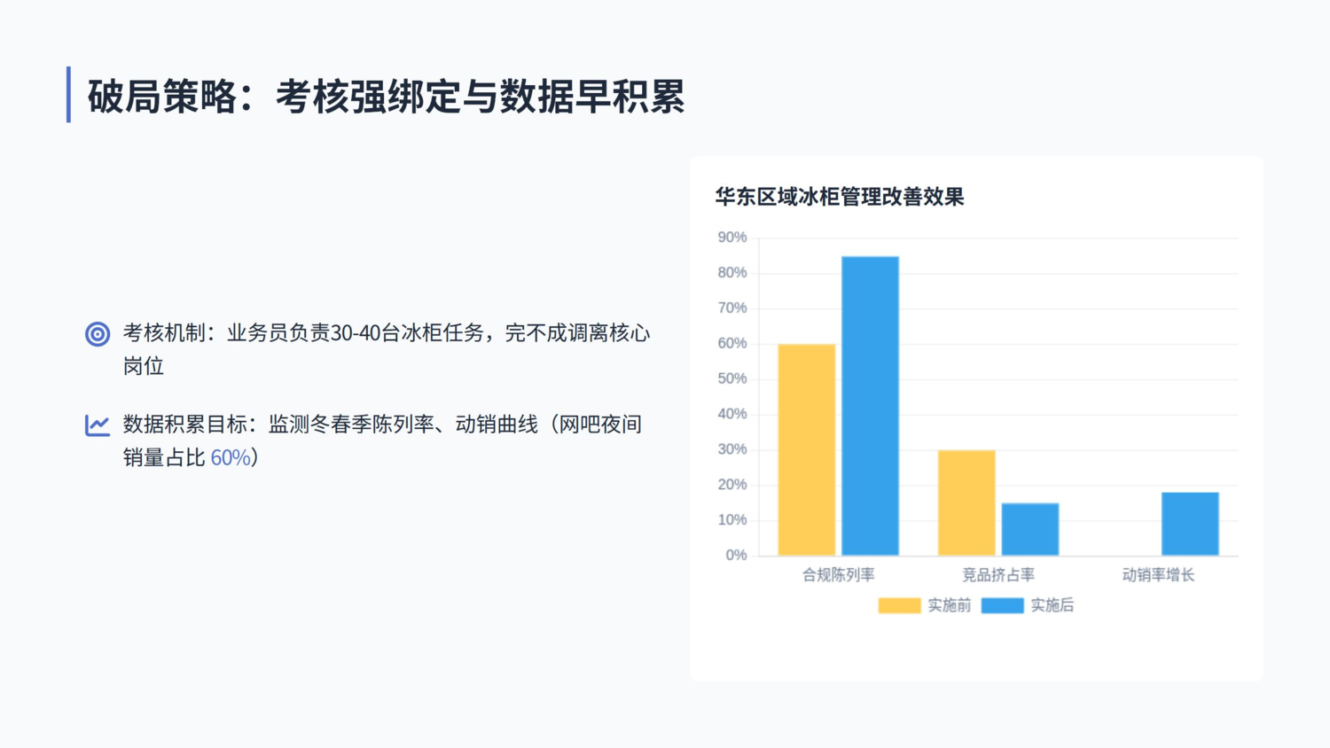 二、统一破局样本:200元激励背后的三维布局逻辑 1.激励差异化:精准引导资源聚焦核心场景 统一没搞“一刀切”的激励,而是推出阶梯政策:在之前没放冰柜的“空白点”新投,每台奖励200元;把小冰柜换成大的,或者在一个点位多投几台,每台奖励100元。这种设计就是要引导业务员优先攻克高价值场景。 这次重点聚焦的五类场景,动销能力突出:运动场馆的单冰柜日均销量比普通社区店高出75%;产业园区因人员集中,旺季单冰柜日均销量能突破50瓶。 而且统一早有成功经验,2024年底类似的激励政策,曾让次年夏季销量增长20%,2025年上半年其饮品营收就达107.88亿元,同比增长10.6%,这也给这次行动加了“定心丸”。 2.考核强绑定:压实终端管理责任链条 光有激励不够,统一还配套了严格的考核:每个业务员必须负责30-40台冰柜的投放任务,完不成的直接调离核心岗位。华东某经销商透露,实施后业务员的心态完全变了:以前是“领导催了才去跑门店”,现在会主动每周回访1次,不仅检查陈列,还帮门店整理冰柜,把核心单品挪到前排。 效果也很明显:该区域统一冰柜的合规陈列率从之前的60%提升至85%,竞品挤占率从30%降到15%以下,动销率随之增长18%。而且业务员还会主动收集门店反馈,比如某网吧老板反映“碳酸饮料不够卖”,业务员马上上报,提前调整了该门店的补货量。