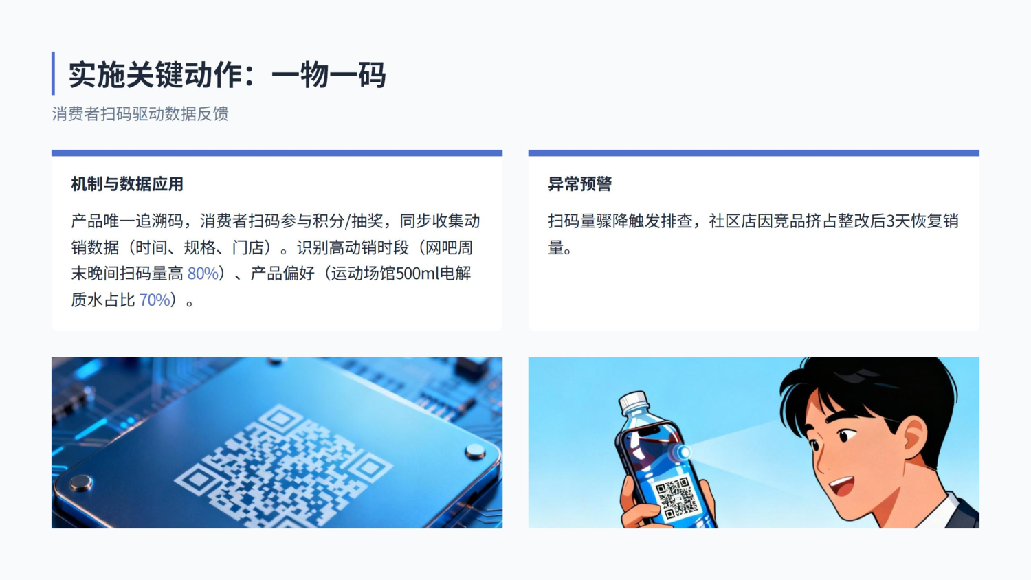 3.数据早积累:为2026旺季补货打基础 提前8个月启动行动,本质是为了攒数据。统一会监测冬季和来年春季的冰柜陈列率、产品动销曲线,比如发现网吧场景的夜间(20:00-次日2:00)销量占比达60%,运动场馆的高峰时段集中在14:00-18:00,这些数据都会用来调整2026年夏季的补货策略。针对网吧在傍晚提前补货,针对运动场馆在中午前完成补货,避免高峰时段断货。 另外,统一还会记录不同场景的产品偏好:比如产业园区门店,500ml装的冰红茶销量占比达40%;台球厅门店,柠檬味饮料更受欢迎。这些数据能帮渠道总监优化产品配比,避免“有的产品卖断货,有的产品放过期”的情况。 三、冰柜管理落地:“一物一码+陈列有礼”双驱动的三大关键动作 1.一物一码筑防线:消费者扫码反馈动销数据 统一给每款终端销售的产品都贴了**追溯码,消费者买完扫码,既能参与积分兑换、新品试用抽奖,还能帮企业收集动销数据。系统会自动记录扫码时间、产品规格,再通过产品出库时绑定的“经销商-门店”链路,精准定位到具体门店。 比如某网吧门店,周末晚间的扫码量比工作日高80%,系统会标记这个时段为“高动销期”;某运动场馆门店,500ml装电解质水的扫码量占比达70%,说明这款产品在该场景更受欢迎。有了这些数据,企业不用再等业务员手动盘点,就能实时知道每个门店的库存消耗速度。 要是某门店的扫码量突然下降,比如连续3天同比减少20%,系统会马上提醒区域主管上门排查。可能是冰柜坏了,也可能是被竞品挤占了。之前某社区店就因为扫码量骤降,主管上门发现冰柜里一半都是竞品,及时整改后,三天内销量就恢复了正常。