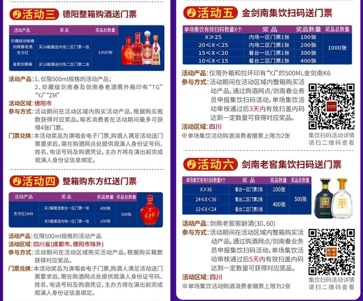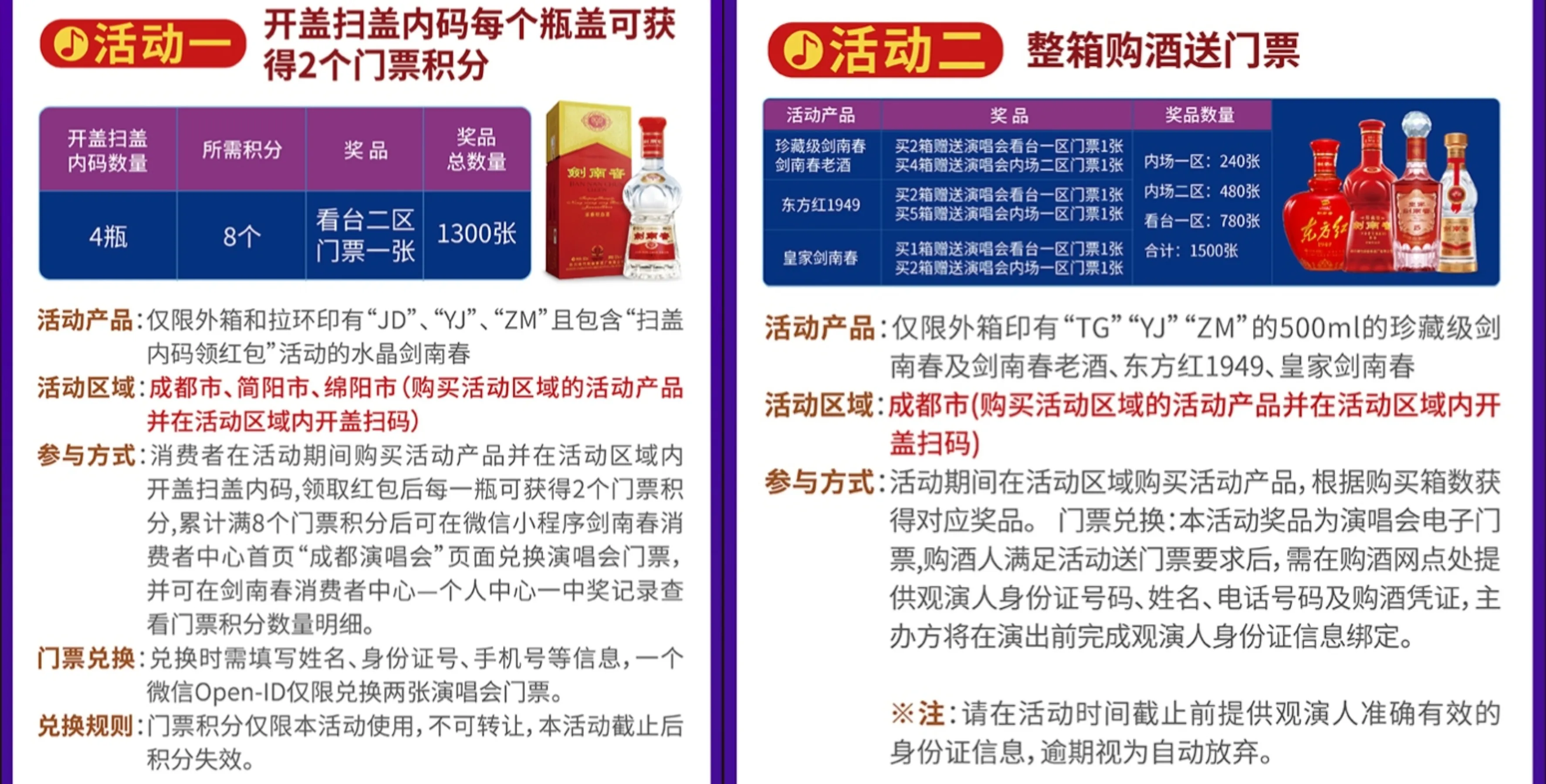 比如消费者买一瓶水晶剑扫码能得积分,攒够8个积分就能换一张看台二区的门票;而如果买了4箱珍藏级剑南春或者剑南春老酒,则可以拿到一张内场二区的门票。