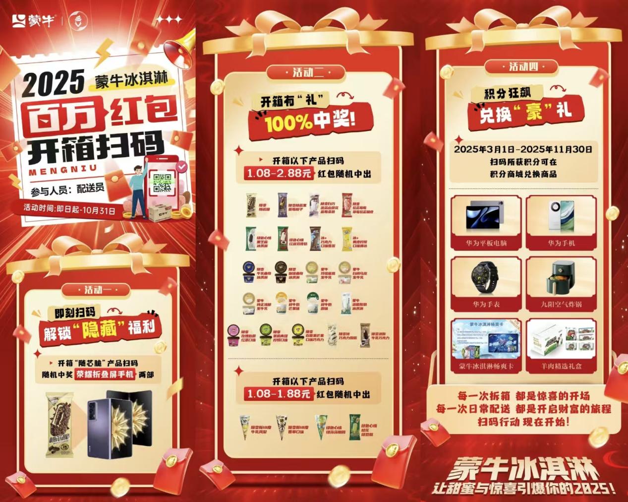 (来源:马上赢情报站) 2)渠道端搬运工困境:行业利润下跌,价格战成行业毒药 对经销商来说,现在的生意就是“吃力不讨好”。根据中国冰淇淋的调研信息,一位河北地区的冻品配送商指出,不仅行业龙头以及头部品牌卷价格,二三线的小厂更甚。同类产品价格的恶意竞争,严重到售价几乎贴近进价,用一款产品贴补另一款,利润从哪来? 经销商夹在中间,成了“免费搬运工”,从厂家拿货,送到终端门店,赚的钱勉强够覆盖仓储、冷链成本,有时候还要用卖得好的产品贴补卖不动的,长期下来根本没盈利空间。 3)冰淇淋头部品牌纷纷拥抱一物一码活动 当传统促销走到死胡同,蒙牛、和路雪、五羊、旺旺这些头部品牌率先转身,把宝押在了一物一码上。他们不是随便做个“扫码抽奖”,而是真的想靠这个工具解决行业痛点。 以前给渠道的补贴,要么被中间环节截留,要么不知道花到了哪;给消费者的优惠,发出去就没了下文,不知道谁用了、有没有复购。 而一物一码能把费用直接给到配送员、商户和消费者,每一笔钱都能留下数据痕迹,还能知道“谁在扫码、扫了多少、有没有后续行动”。比如蒙牛给配送员扫码发红包,能确认产品真的铺到了终端;康怡给商户扫码抽奖,能刺激商户多进货;五羊给消费者扫码送复购礼,能让消费者再买一次。 这种“精准触达+数据可追溯”的模式,正好戳中了行业“费用乱、效果差”的痛点,所以头部品牌才会集体拥抱。 02头部冰淇淋品牌一物一码活动共性特征分析 通过拆解蒙牛、和路雪、康怡等品牌的活动,能发现他们的一物一码玩法不是随便设置的,而是精准踩中了“渠道提效、用户留存”的核心需求: 1)精准的目标群体定位 不同人群的需求不一样,头部品牌做活动时,从不会“一刀切”。 针对配送员,蒙牛的玩法很有针对性: 搞“最强开箱王”排名,扫码满6000箱能拿800元,满2000箱能拿500元,还能累计积分换豪礼。