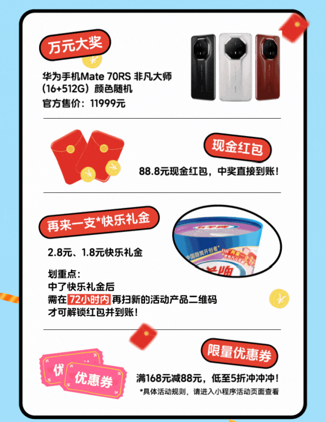 实物奖励主打“吸引力”:蒙牛送荣耀折叠屏手机,康怡、五羊送小米、华为手机,旺旺送5g金项链,这些产品价值高、大家都想要,能吸引更多人参与;而且会强调“名额有限”,比如康怡商户抽奖“先扫先得”,制造紧迫感,让大家不敢拖延。