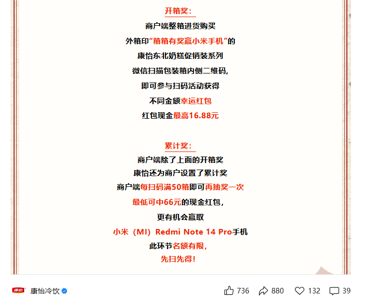 这是因为配送员是“最后一公里”的关键,他们决定了产品能不能及时铺到终端冰柜,用阶梯奖励和长期积分,既能让配送员愿意多铺货,又能避免他们“扫空箱凑数”,保证铺货的真实性。 针终端商户,康怡的“箱箱有奖”则能拉动终端商户的进货意愿: 商户开箱扫码就能拿红包,门槛特别低。商户最怕“进货后卖不动”,低门槛的红包能降低他们的进货顾虑;而“满50箱抽小米手机,最低能拿66元红包”,又能刺激商户多进货,形成“进货—扫码—再进货”的循环。