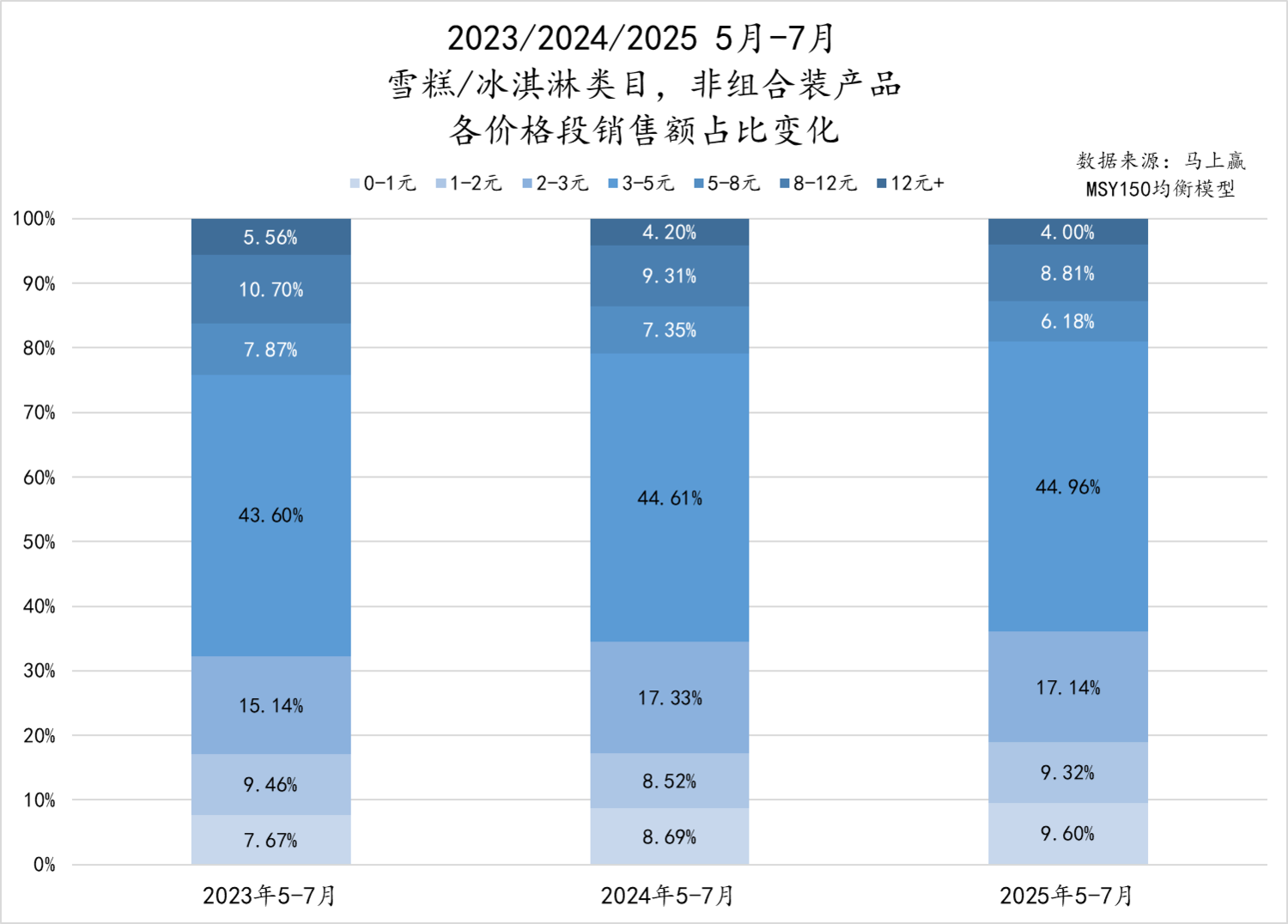 (来源:中国冰淇淋) 然而,与供给端的狂热形成鲜明对比的是需求端的冷静理性。消费者不再盲目追求高价产品,而是更加注重性价比。 市场呈现出明显的“"低中价主导、高价收缩"”趋势,0-8元价格带的产品占据了超过80%的市场份额,而8-12元及12元以上的高端产品市场持续萎缩。这种消费理性化的趋势,使得整个行业陷入了“"低价竞争—利润压缩"”的困境。