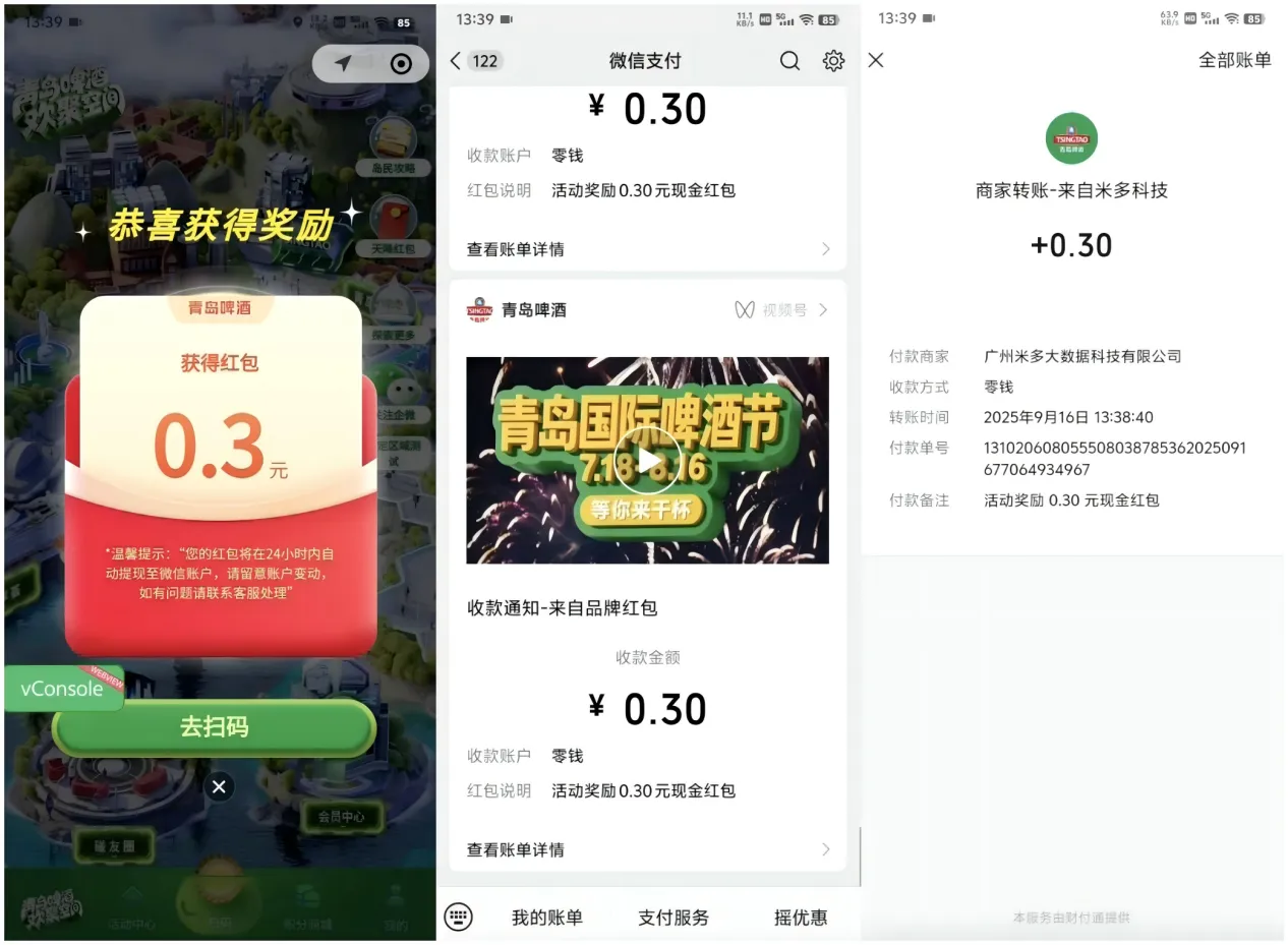 用户扫码领取的红包,不只是单纯的现金到账通知,还同步显示了青岛啤酒的视频号入口、公众号关注提示。用户在确认“拿到钱”的同时,很自然地就能看到品牌的私域入口与品牌宣传。品牌只是在不打扰的前提下,把红包通知变成了品牌触点。