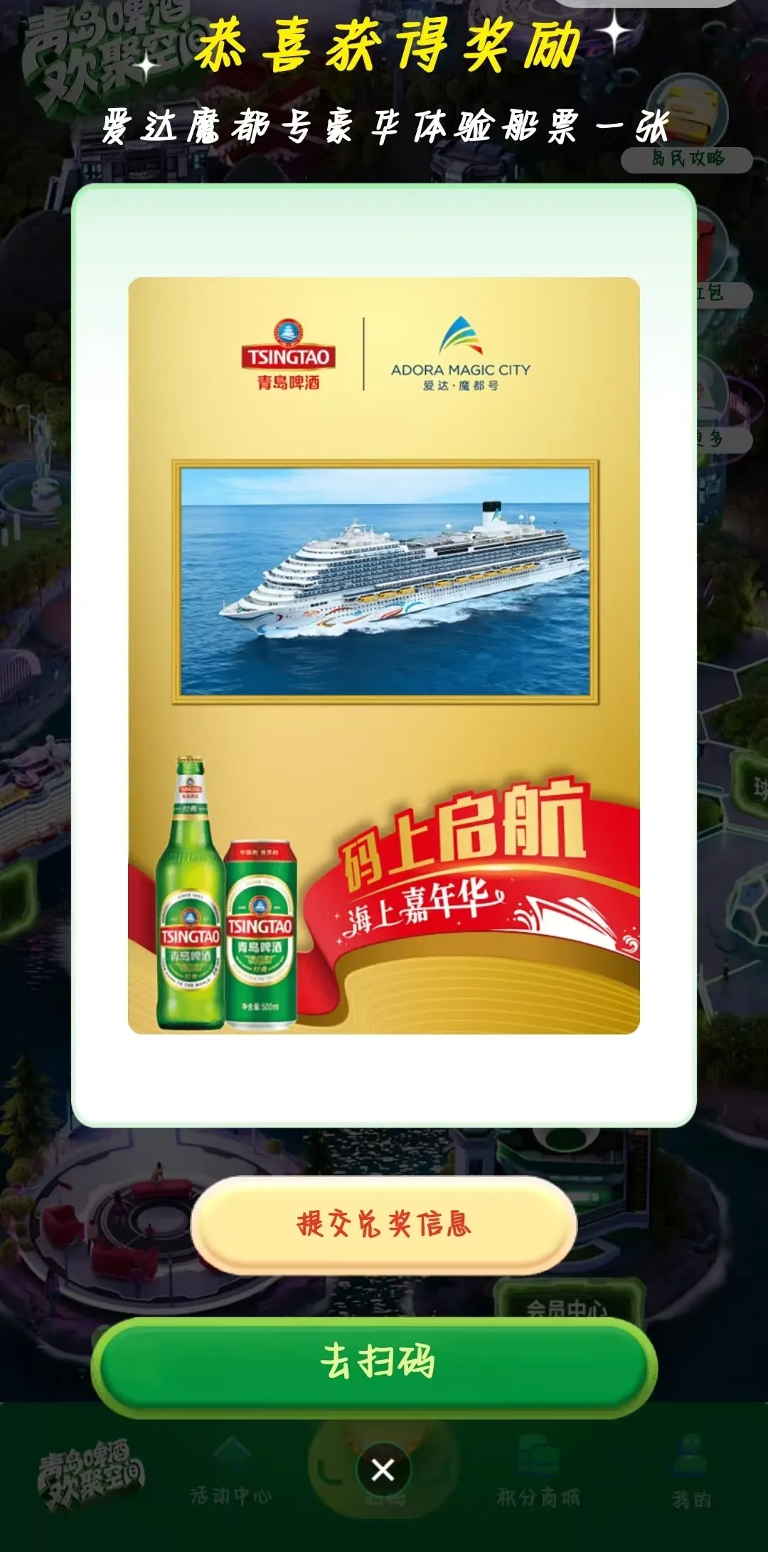 核心奖项既有实打实的现金福利,比如0.18元到1000元不等的随机红包,也有能直接抵扣消费的青岛啤酒线上商城优惠券,面额从10元到30元不等,最吸引人的还是价值3999元的爱达魔都号豪华邮轮体验船票,一共准备了1000张,对消费者来说吸引力十足。