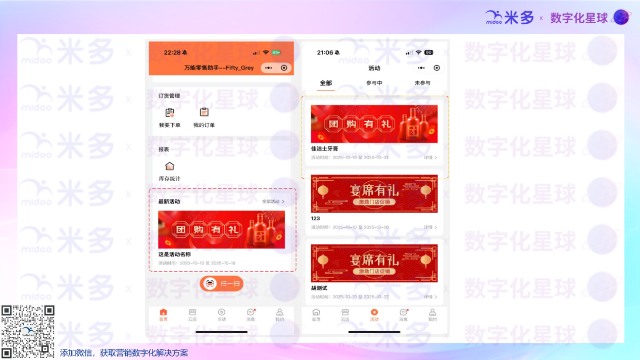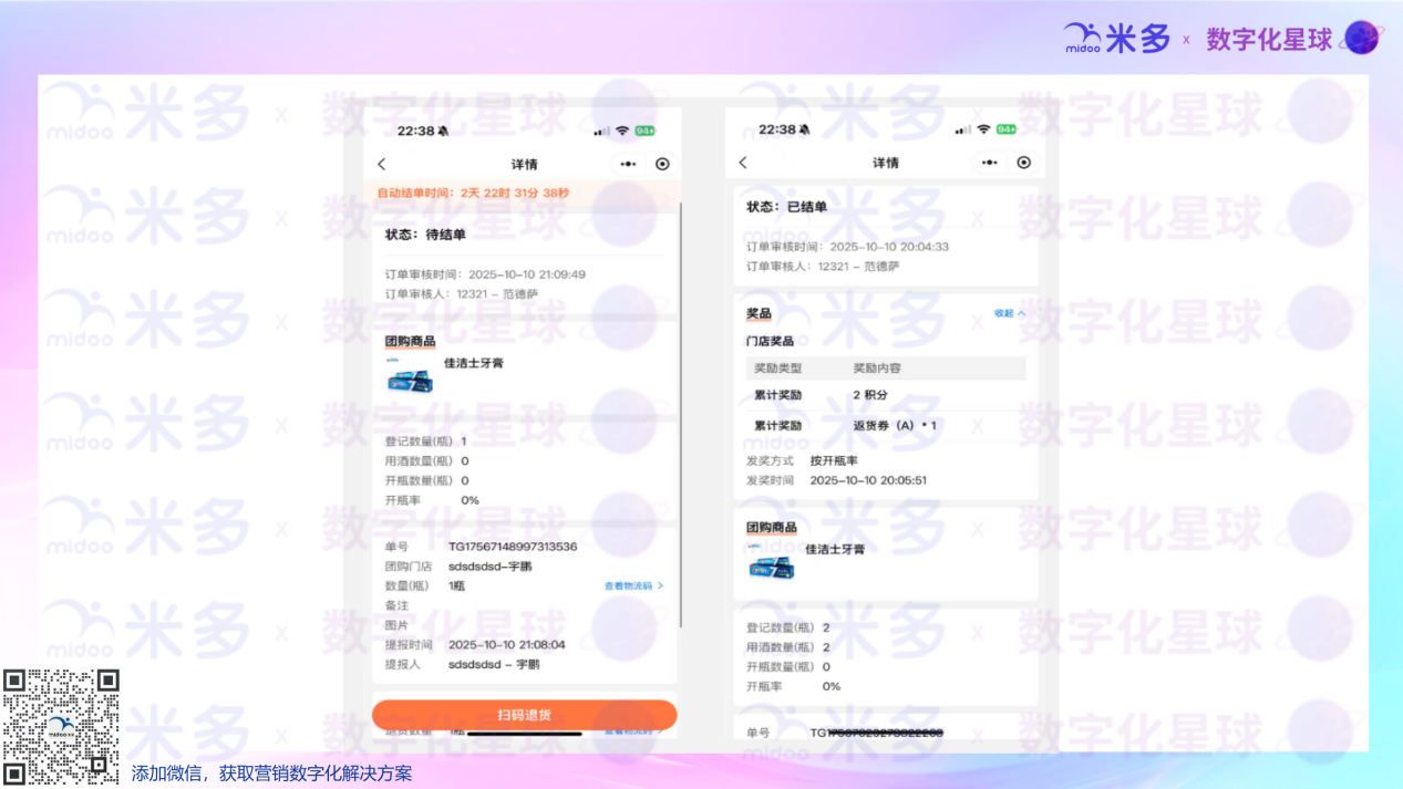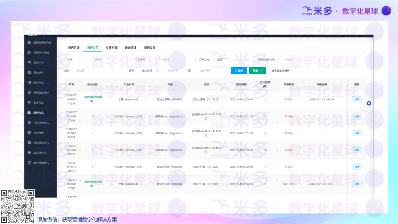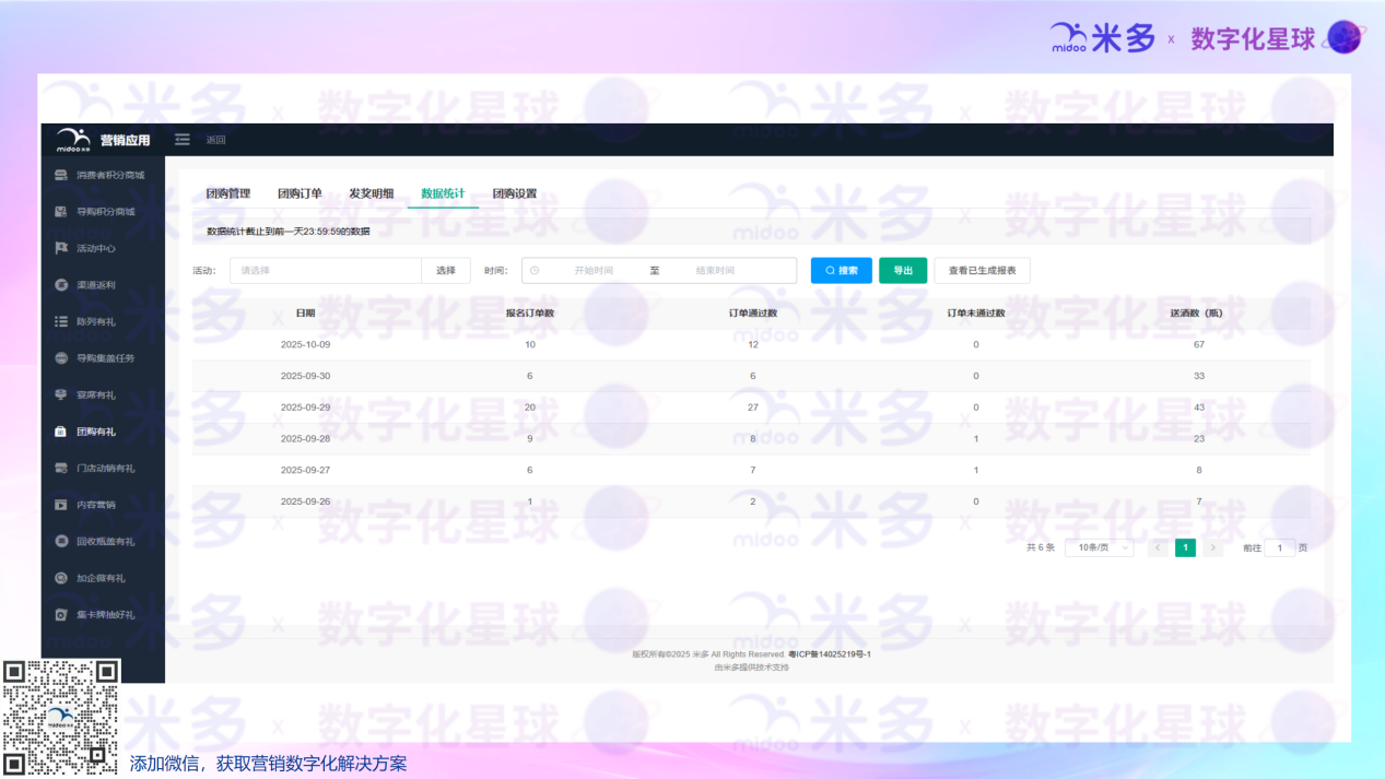 3)按指定码段精准投放 这种方式更偏向于增加团购的趣味性和话题性,同时控制成本。品牌可以为某笔团购订单的瓶码设置特定规则,比如尾号为特定数字的瓶码属于幸运码,扫码者能获得额外的抽奖机会或小礼品。这种设计既能让消费者在开瓶时多一份期待,也能通过“幸运”的话题感,让客户在社交场景中主动提及品牌,形成二次传播。 这三种精准控奖策略的核心,在于“针对性”而非“普遍性”。品牌不需要投入大量成本覆盖所有消费者,而是把资源集中在核心人群、关键场景上,用“确定性的惊喜”替代“无差别的优惠”,将好钢用在刀刃上,极大提升核心客户的满意度、忠诚度与品牌粘性。 3.独立专业管理:告别混乱,运筹帷幄 传统团购业务之所以会变成“糊涂账”,核心原因在于缺乏专属的管理体系,订单周期与其他场景混同、业务数据与宴席等数据混杂。 “工欲善其事,必先利其器”。“团购有礼”作为一个独立的营销应用,拥有独立的专业管理模块,让团购业务清晰、透明、可追溯。 1)灵活的订单周期与状态管理