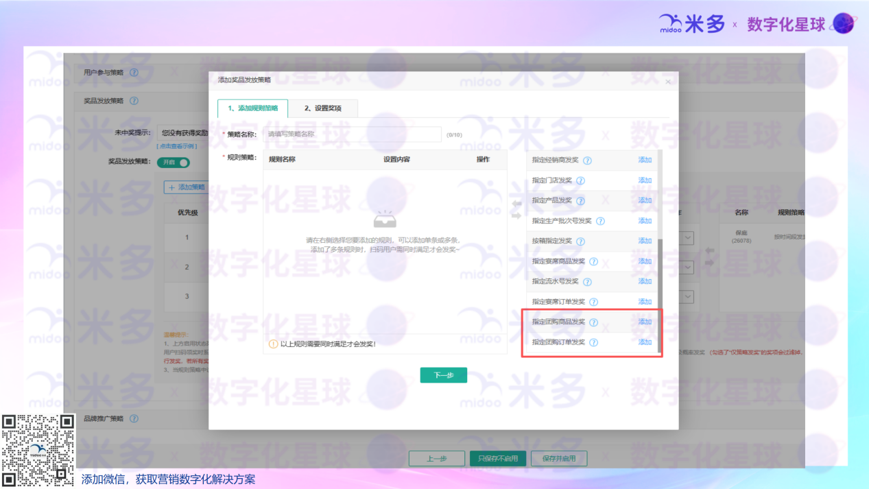关联开瓶即奖+累计开瓶再奖的激励组合拳,将门店老板的角色,从一个被动的卖货者,彻底转变为一个主动为品牌寻找订单、拓展客户、并极度关心最终消费和扫码的“事业合伙人”。 这也是米多“全链共赢”价值观的完美体现。 2.C端精准控奖:让每一分钱都花在“刀刃”上 对于品牌商来说,大客户的维护始终是个难题。 大客户对品牌的销量和口碑影响重大,但想维护好大客户关系,成本又十分高昂,且效果难以衡量。如果用一场常规促销去覆盖一个重要的团购订单,就像用“高射炮打蚊子”,既浪费了弹药,又无法让“关键先生”感受到应有的尊重和专属感。 “团购有礼”搭载了“导弹级”的精准控奖策略库,通过多样化的控奖策略,让品牌的每一笔投入都能精准触达核心客户还能实现“一人一策”的**体验。 1)按开瓶顺序精准投放