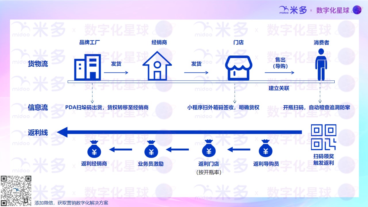 例如可调整为“消费者扫码后,终端需等待15天确认无退货,再发放全额返利”,避免经销商提前套取奖励。 同时,建立“经销商黑名单制度”,对多次违规扫码、窜货的经销商取消授权,并公开违规信息,强化渠道合规意识。 3.多方联动:酒企+平台+监管形成合力 单一酒企难以独自解决乱象,需构建“三方联动”机制: 一是酒企与平台共建合规体系,签订《违规产品管控协议》,要求平台对“开盖酒”“无损开箱”等商品强制下架,对违规商家处以罚款或清退; 二是联合监管与消协,借鉴四省消协2025年的消费提示模式,酒企可联合市场监管部门发布《开盖酒风险预警》,曝光违规商家名单,同时向消费者普及“开盖酒识别方法”(如检查包装细微拆痕、通过官方小程序查询码的有效性),从需求端压缩开盖酒市场; 三是消费者教育,通过官方公众号、线下门店等渠道,告知消费者“开盖酒无售后保障”,引导其通过官方旗舰店、连锁专卖店等正规渠道购买,降低违规产品的市场需求。 总结: 习酒对开盖酒“拒售后”的声明,是酒企数字化转型中的一次“紧急刹车”,却也暴露了“一物一码”落地中的核心矛盾:工具本身是推动渠道精细化管理的利器,但缺乏规则设计、技术支撑与多方联动,就可能沦为套利工具。 对酒企渠道总监与数字化运营负责人而言,破局的关键不在于放弃数字化,而在于将“一物一码”从“单一扫码功能”升级为“技术+规则+监管”的全链路体系。 唯有如此,才能避免“数字化投入反伤品牌”,让“一物一码”真正成为驱动增长的动能,而非黄牛套利的“温床”。 参考来源 1 新黄河:“违规”“不提供任何检验和售后服务”,让酒企“发飙”的开盖酒是什么? http://m.toutiao.com/group/7565342849676493322/?upstream_biz=doubao 2 消费者报道《“违规”“不提供任何检验和售后服务”,让酒企“发飙”的开盖酒是什么?》 https://mp.weixin.qq.com/s/Sax5MHGFLmvocGXxr2kYjQ 关于米多 米多公司成立于2014年,是国内领先的营销数字化整体解决方案提供商,在营销领域致力于以企业业务能力(EBC)为核心,构建基于“立体连接、数据共通、流量共享、全景共鸣、全域赋能、全链共赢”的产业互联网营销服务平台,赋能企业通过“网络协同”和“数据智能”双螺旋引擎,用数字化驱动业务增长。累计服务酒类行业、快消行业、日化家清行业、化工建材行业、茶叶行业等品牌类企业逾3000家,包括茅台、可口可乐、宝洁、高露洁、维达、立白、雪花啤酒、劲牌、绿箭、嘉士伯、美涂士、华新集团等。 如想获取“营销数字化解决方案”,请私聊我~ 声明:此篇为米多公司的原创文章,转载请标明出处。链接:https://www.ebcone.com/sys-nd/307.html